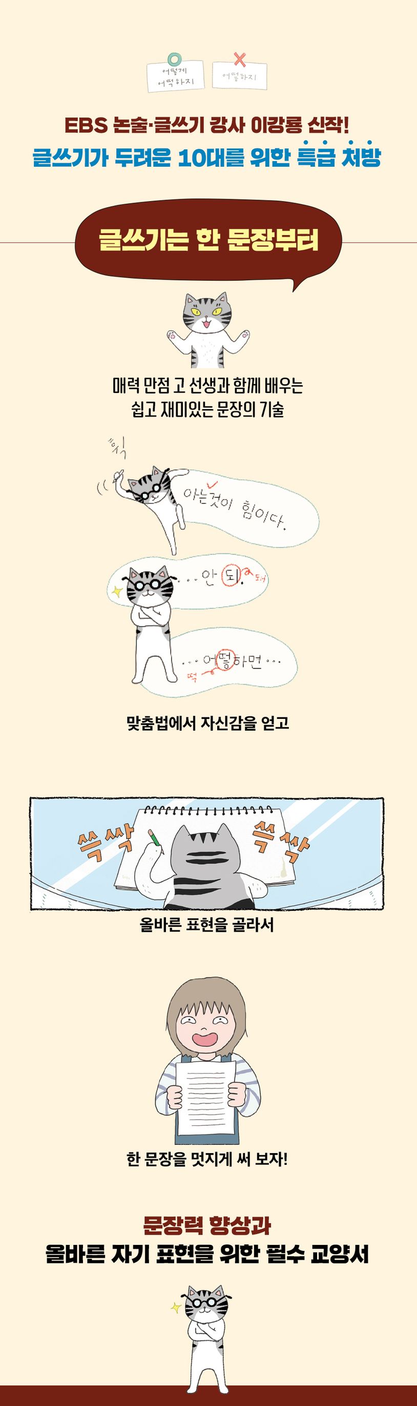 ‘되’와 ‘돼’, ‘던지’와 ‘든지’ 등 누구나 헷갈리는 맞춤법과 기초적인 띄어쓰기를 짚어 보는 것에서 시작해, 다채로운 꾸밈말과 좋은 생각을 담은 표현을 고민한 다음, 한 문장을 멋지게 완성하는 글쓰기 수업이 한 권의 만화에 담겼다. SNS 글쓰기와 학교 과제, 독서 감상문, 자기소개서, 공모전 등 다양한 글쓰기 과업 앞에서 괴로움을 느끼고 있을 청소년에게 든든한 힘이 되어 줄 책이다. EBS 등에서 논술ㆍ글쓰기 강사로 활약한 이강룡 작가가 글을 구성했고, 다양한 어린이책의 그림을 그려 온 국민지 작가가 만화를 완성했다. 흥미진진한 만화 속에 글쓰기 지식이 맞춤하게 녹아 있어 가볍게 읽히면서도 유익하다.