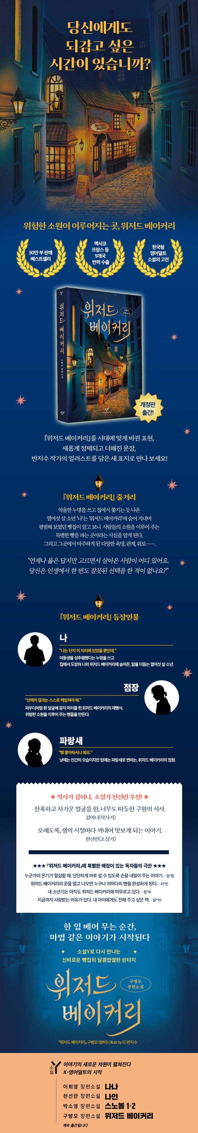 50만 독자를 사로잡은 구병모 장편소설 『위저드 베이커리』가 소설Y 시리즈로 다시 돌아왔다. 2009년 출간 이후 멕시코 프랑스 태국 등 9개국에 번역 수출되며 꾸준히 사랑받은 작품으로, 가족에게서 도망친 한 소년이 우연히 몸을 피한 기묘한 빵집 ‘위저드 베이커리’에서 마법 같은 이야기가 흥미롭게 펼쳐진다. 시대에 맞게 바뀐 표현, 새롭게 정제되고 더해진 문장, 반지수 작가의 유려한 일러스트가 돋보이는 이번 개정판에선 구병모 작가 특유의 달콤쌉쌀한 판타지가 다시 한번 빛난다.