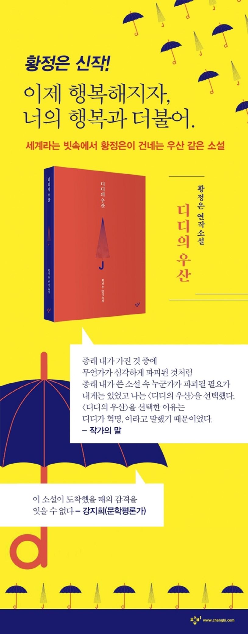 넓고 탄탄한 독자층을 형성한 동시에 평단의 확고한 지지를 받으며 한국문학을 대표하는 작가 중 한 사람으로 자리매김한 황정은의 연작소설 『디디의 우산』. 《d》라는 제목으로 다시 선보이는 김유정문학상 수상작 《웃는 남자》, 《문학3》 웹 연재 시 뜨거운 호응을 얻었던 《아무것도 말할 필요가 없다》를 묶은 소설집이다. 2014년 세월호참사와 2016~17년 촛불혁명이라는 사회적 격변을 배경에 두고 개인의 일상 속에서 혁명의 새로운 의미를 탐구한 작품들을 만나볼 수 있다.