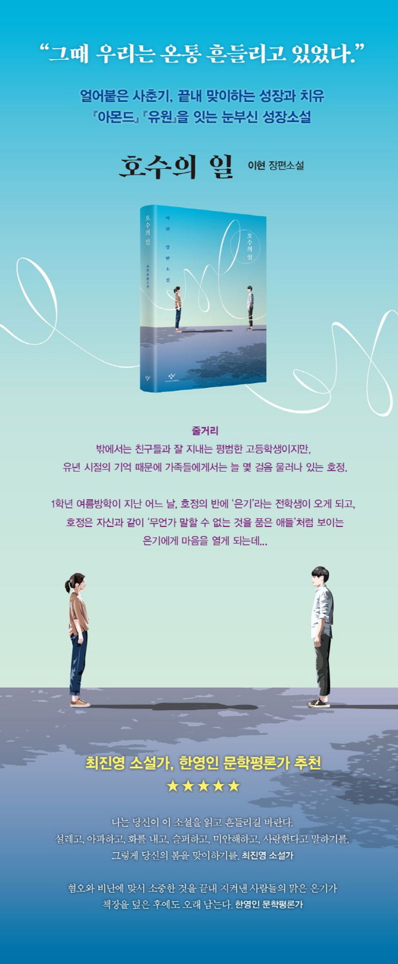 성장하는 이들의 마음을 세밀히 살펴 온 이현 작가의 신작 장편소설 『호수의 일』이 출간되었다. 열일곱 살 주인공 호정이 은기와 만나 경험하는 설렘과 사랑, 각자의 상처를 딛고 일어서는 과정을 담았다. 정의하지 못해 혼란스러운 감정들을 매만지는 탁월한 문장이 돋보이며, 첫사랑의 두근거림뿐 아니라 가족, 친구와의 갈등과 외로움 등 한가지로 정리되지 않는 여러 갈래의 깊은 마음을 섬세하게 포착했다. 겨울처럼 혹독하게 십 대의 시간을 통과한 이들, 쉽게 꺼낼 수 없는 마음을 간직한 이들에게 깊은 공감을 불러일으키며 눈부신 치유의 순간을 길어 올리는 성장소설이다.