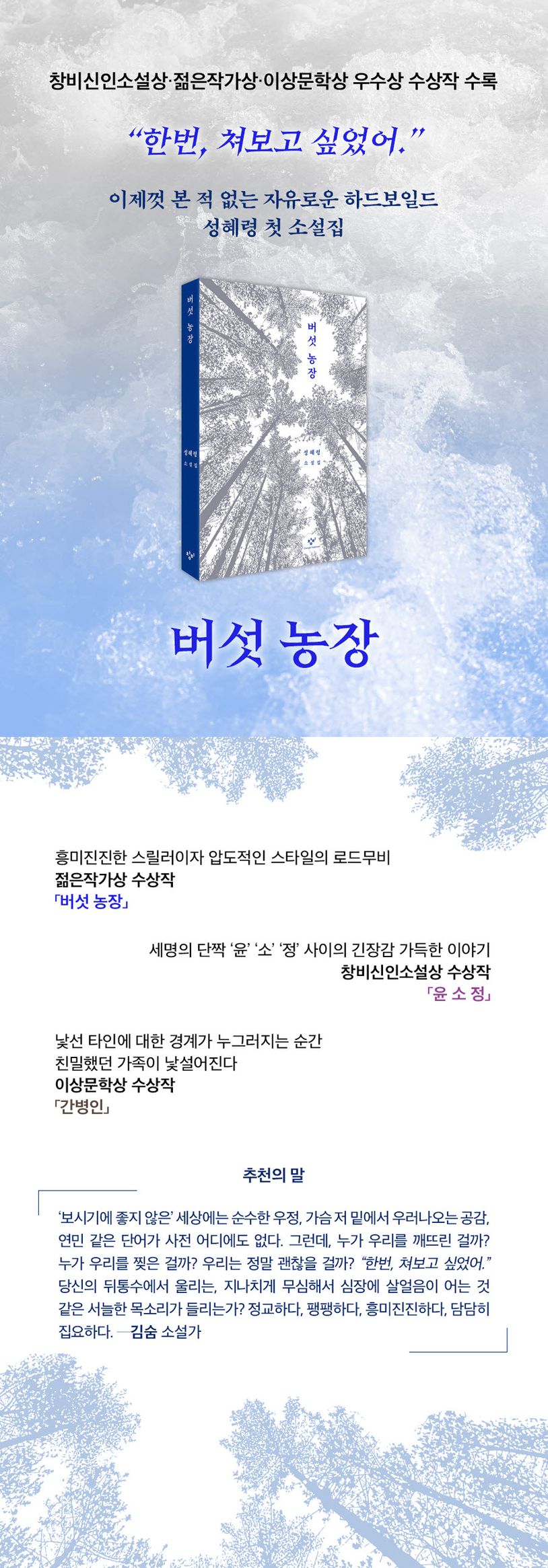 능수능란하게 펼쳐지는 서사적 긴장감, 분열과 고립의 현대사회에 대한 통찰력 있는 시선으로 데뷔 당시부터 평단의 주목을 받아온 작가 성혜령의 첫 소설집 『버섯 농장』이 출간되었다. 특유의 서스펜스와 독보적인 스타일의 힘을 보여준 2021년 창비신인소설상 수상작이자 등단작 「윤 소 정」과 “이 시대의 하드보일드 소설”(정이현, 심사평)이라는 찬사를 받은 2023년 젊은작가상 수상작이자 표제작 「버섯 농장」, 2024년 이상문학상 우수상을 수상한 「간병인」을 비롯한 여덟편의 작품이 실렸다.