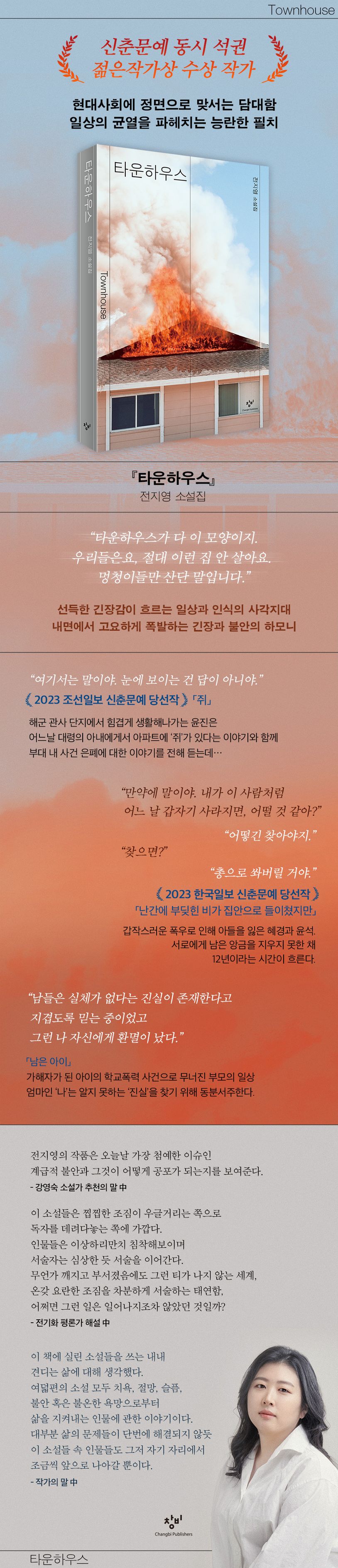 2023년 한국일보와 조선일보 신춘문예에 당선되며 ‘신춘문예 2관왕’으로 화제를 모은 소설가 전지영이 불과 등단 1년여 만에 첫번째 소설집 『타운하우스』를 출간했다. 신중하고도 성숙한 시선이 돋보이며 마지막까지 긴장을 끌고 가는 필력이 남다르다는 평을 받으며 작품활동을 시작한 작가는 신인이라고 믿기 어려운 정연하고도 능란한 필치로 현대사회의 일면을 묘파해나간다. 이번 책에는 신춘문예 당선작 「쥐」 「난간에 부딪힌 비가 집 안으로 들이쳤지만」과 젊은작가상 수상작 「언캐니 밸리」를 비롯한 총 여덟편의 작품을 묶었다.