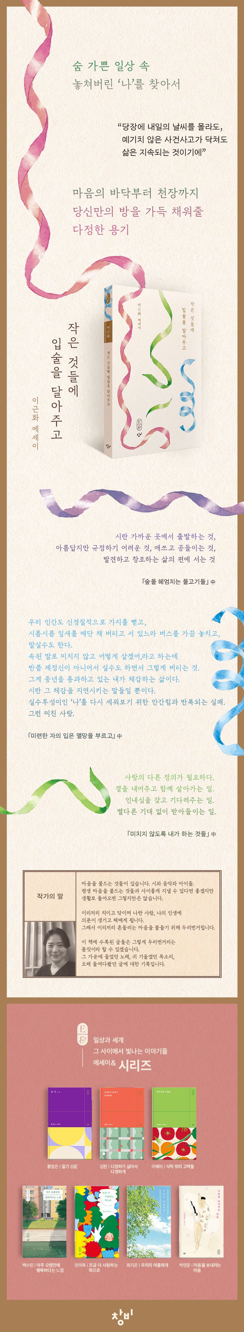 삶의 비의에 지치지 않고 존재의 의미를 탐색해나가는 힘차고 또렷한 목소리의 시인 이근화가 신작 에세이 『작은 것들에 입술을 달아주고』를 창비 에세이& 시리즈로 펴냈다. 이번 에세이에는 시 쓰며 아이들을 키우고 노모를 간병하며 또 학생들을 가르치는, 삶과 시라는 두가지 땅에 동시에 발 디딘 채 매일을 일구어나가는 중견 시인의 풍부한 경험과 사유가 차분한 문장에 담겼다. 특히 비상계엄과 포스트코로나, 기후변화와 인공지능 등 지금 가장 주목받는 주제에서 발원한 고민과 성찰은 사회적 진동과 공명하며 동시대인의 마음에 깊은 파문을 남긴다. 동료 여성, 시민, 시인 들로부터 영감을 받아 앞으로 우리가 나아가야 할 길을 써내려가는 필치 역시 예리하고 유려하다. 다양한 주제를 자유롭게 드나들면서도 작가는 자신의 주변과 내면을 관찰하고 돌보는 일을 잊지 않는다. 일상의 소박한 조각에서 작은 행복을 발견해내는 명랑한 어조가 지친 마음에 활기를 보태듯 경쾌하다.
