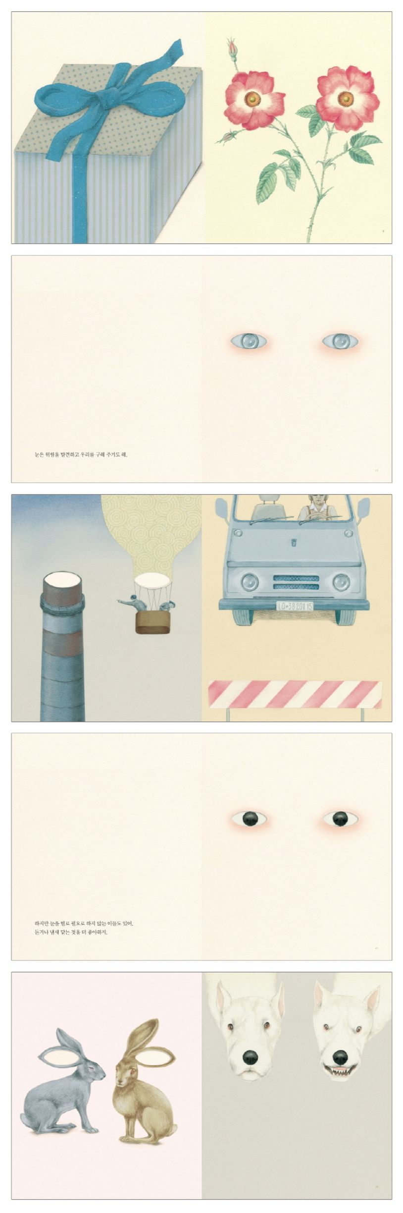 이 책에는 두 개의 구멍이 뚫린 장면이 반복적으로 나옵니다. 그 구멍들을 통해 비치는 그림이 마치 눈처럼 보이지만, 책장을 넘기면 전혀 다른 그림이 나옵니다. 이러한 반전을 통해 '눈'과 '본다'는 것의 한계에 대해 생각해 볼 수 있습니다. 또한 볼 수 있는 사람과 볼 수 없는 사람의 차이는 책장 한 장을 넘기는 것과 같은 뿐이라는 의미를 전하기도 합니다.