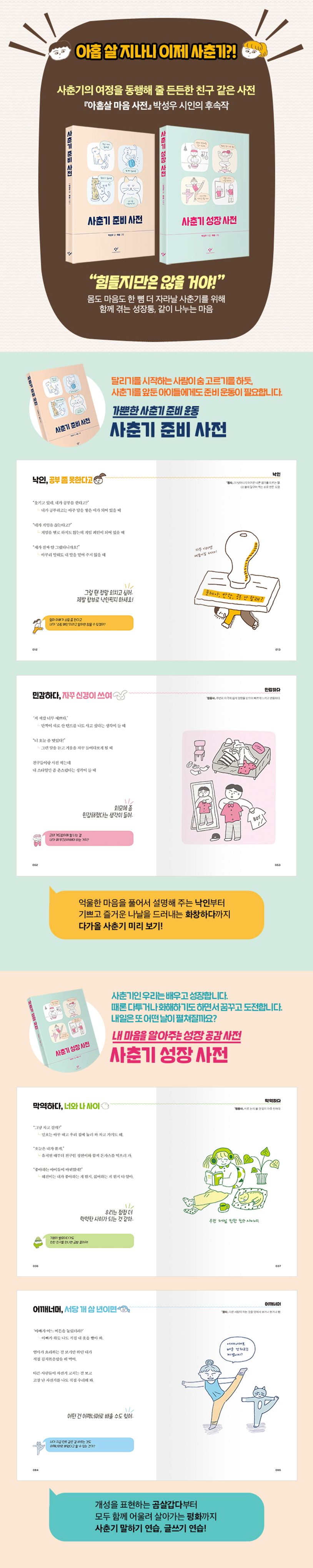 10대의 일상에서는 자주 쓰이지 않아 다소 낯설 수 있는 말, 그러나 문장 구사력을 높이는 데에 큰 도움이 될 수 있는 말을 다채롭게 담아낸 『사춘기 성장 사전』. 청소년들이 평소 무슨 뜻인지 몰라서 궁금해 했던 낱말이나 실제 검색해 본 낱말 위주로, 우정, 성찰, 배움, 도전 등 성장과 관련된 여러 말과 그 말이 쓰이는 상황을 재미있는 그림과 함께 사전 형태로 소개한다.