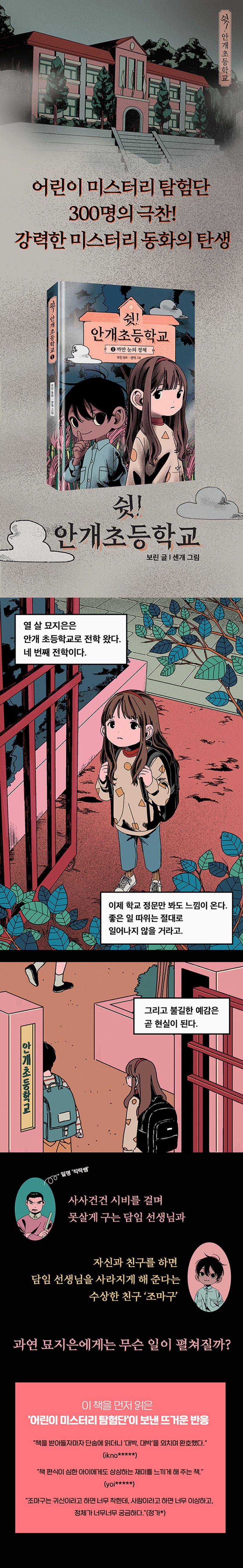 기묘한 상상력으로 현실과 환상을 넘나드는 보린 작가가 미스터리 동화 시리즈 『쉿! 안개초등학교』를 선보인다. ’암흑도로‘ ’해골계곡‘ ’빨간목욕탕‘ 등 이름만 들어도 서늘한 분위기를 풍기는 동네에 묘지은이 이사를 오면서 오싹한 모험이 펼쳐진다. 첫 권에서는 묘지은이 안개초등학교에 전학 오고 정체를 알 수 없는 ’조마구‘와 친구가 되는 과정이 흥미진진하게 그려진다. 묘지은을 괴롭히는 자를 조마구가 혼내 주고, 겁 많고 소극적이었던 묘지은이 자신에게만 벌어지는 이상한 일들에서 벗어나기 위해 용기를 내는 장면은 독자들에게 짜릿한 카타르시스를 안겨 준다.