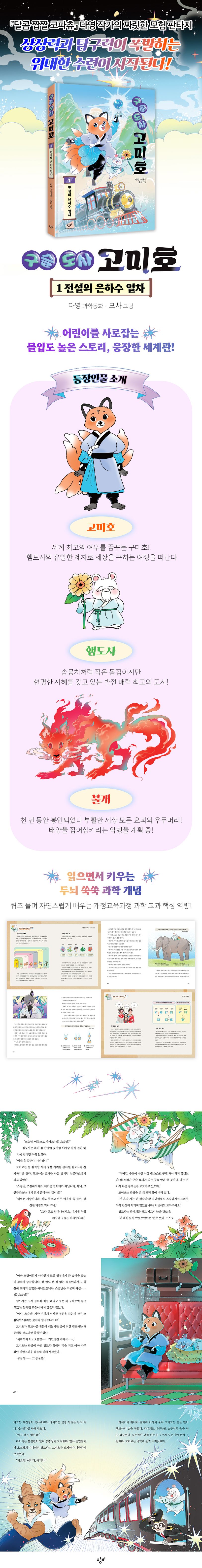 현직 초등 교사이자 영재 교육 전문가인 『달콤 짭짤 코파츄』 시리즈의 다영 작가가 신작 『구슬 도사 고미호』를 선보인다. 세계 최고의 여우가 되기 위해 수련에 몰두하던 고미호는 요괴들의 우두머리 ‘불개’가 부활했다는 불길한 기운을 감지한다. 불개의 부활을 막기 위해 고미호는 전설 속 은하수 열차에 올라 신비한 구슬을 찾아 떠나는데……. 과연 고미호는 구슬 아홉 개를 모두 모아 불개로부터 세상을 구할 수 있을까? 『구슬 도사 고미호』는 짜릿한 모험 이야기 속 과학 퀴즈를 자연스럽게 녹여 낸 신개념 판타지 동화다.