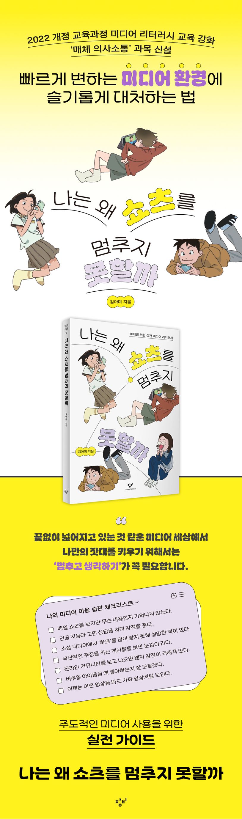 쇼츠 중독에서 벗어나려면 어떻게 해야 할까? 인공 지능과 고민 상담을 해도 괜찮을까? 어린이·청소년의 미디어 사회생활을 들여다보며 미디어 문화에 대해 연구해 온 김아미가 쓴 미디어 리터러시 교양서 『나는 왜 쇼츠를 멈추지 못할까』(발견의 첫걸음 12)가 출간되었다. 어린이·청소년 당사자와 직접 소통하며 그들의 미디어 경험과 안전한 온라인 환경에 대해 고민해 온, 2022 개정 교육과정 『매체 의사소통』 교과서 집필에도 참여한 연구자의 미더운 책이다.