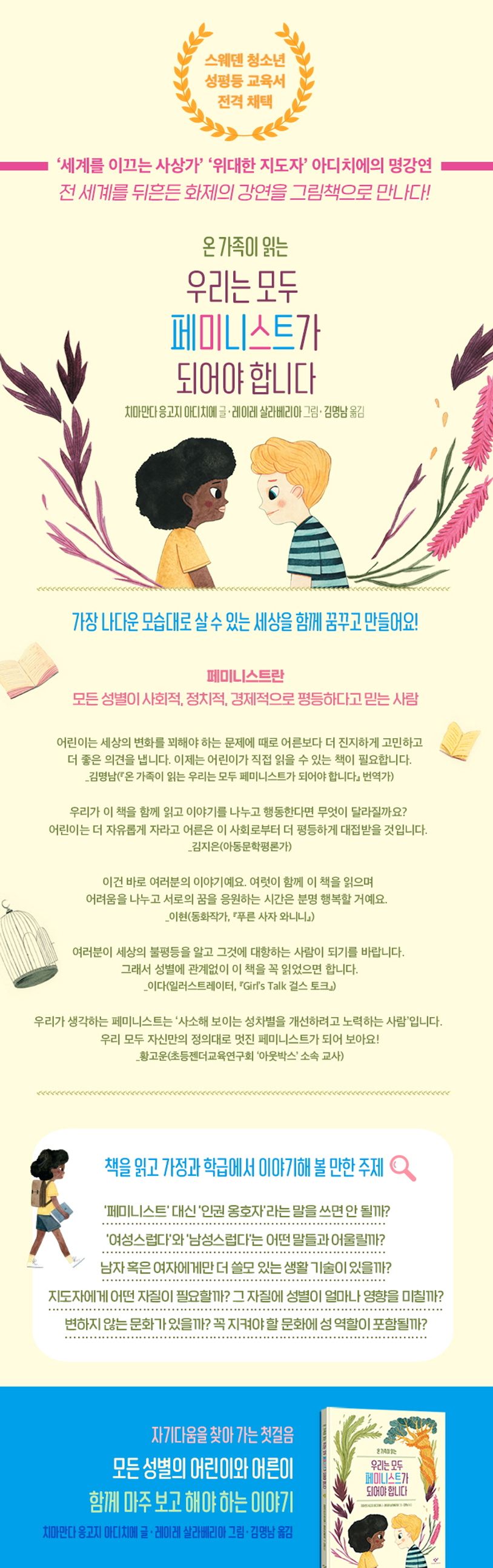 ‘세계를 이끄는 사상가’(『포린 폴리시』 2013), ‘영향력 있는 100인’(『타임』 2015), ‘위대한 지도자 50인’(『포춘』, 2017)으로 선정된 치마만다 응고지 아디치에의 명강연이 그림책으로 만들어져 어린이 독자를 만난다. 유튜브에서 700만에 육박하는 조회 수를 기록한 아디치에의 테드(TED) 강연은 2014년 『우리는 모두 페미니스트가 되어야 합니다』라는 책으로 묶여 32개 언어로 전 세계에 소개되었고, 스웨덴에서는 청소년 성평등 교육서로 채택되었다. 이 책을 어린이 눈높이로 풀어 쓴 『온 가족이 읽는 우리는 모두 페미니스트가 되어야 합니다』는 페미니즘을 처음 접하는 어린이와 청소년은 물론 어른이 함께 읽고 토론하기에 맞춤한 책이다.