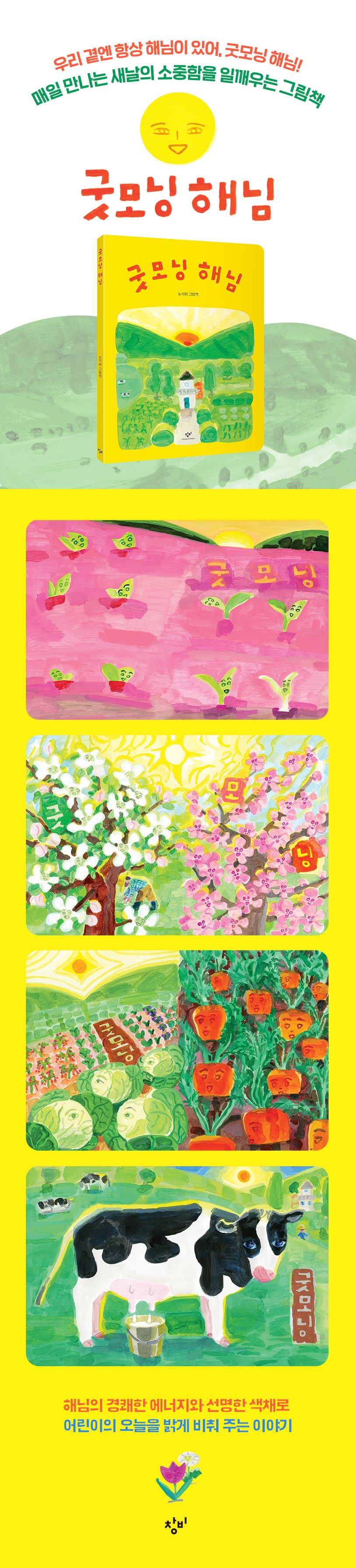 순수 회화부터 일러스트레이션, 에세이까지 다양한 분야에서 활동하는 아티스트 노석미의 그림책 『굿모닝 해님』이 출간되었다. 매일 따사로운 햇살을 받으며 건강하게 자라는 동식물이 감사한 마음을 담아 해님에게 다정히 인사하는 모습을 경쾌하게 그렸다. 눈이 소복이 쌓이는 겨울부터 곡식이 익어 가는 가을까지 변화무쌍한 사계절의 아름다운 풍경이 책장 가득 펼쳐진다. 작가 특유의 개성 있는 화풍으로 생기로운 자연을 실감 나게 전하는 한편 우리의 하루하루가 얼마나 소중한지 깨닫게 하는 작품이다.