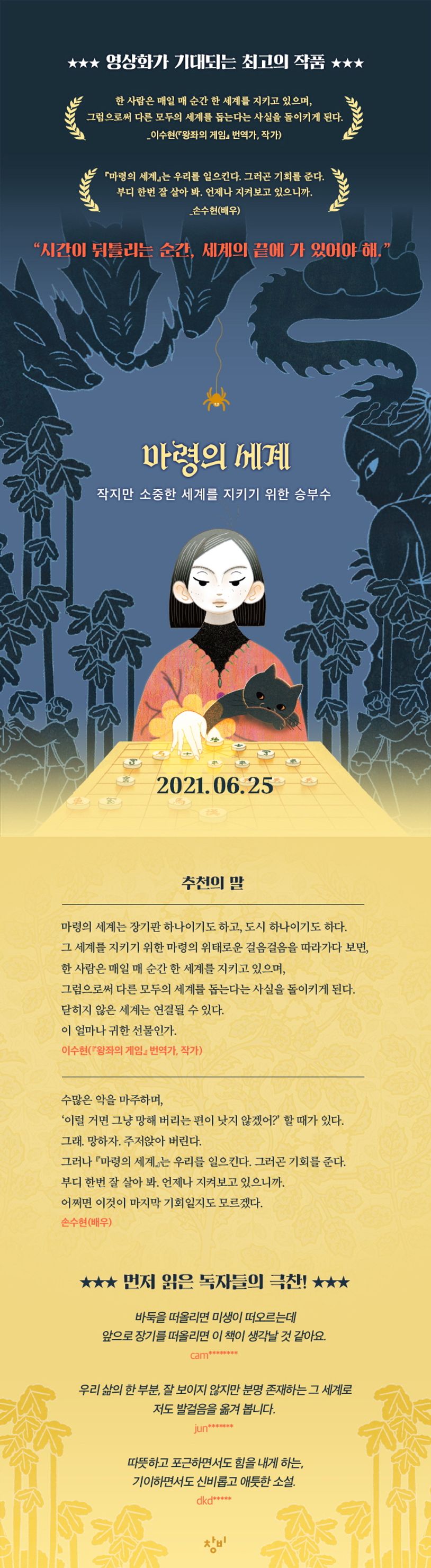 최상희 장편소설 『마령의 세계』(창비청소년문학 103)는 마녀의 딸인 주인공 ‘마령’이 멸망의 징조가 가득한 가운데 동생 ‘마루’를 구하기 위해 진정한 마녀로 거듭나는 이야기다. 정체가 의심스러운 장기 동아리 친구들이 흥미를 자아내며, 곳곳에 포진한 장기 게임은 세계와 인생의 이치를 생각해 보게 한다. 매일 아침 괴물들이 갇힌 방에 결계를 친 뒤 학교에 가고, 동생과 고양이, 친구들이 함께하는 일상은 특별하지 않지만 소중하다. 그런 세계를 지키기 위해 마령은 흔쾌히 자신의 모든 것을 건다. 불확실한 미래에 절망하지 않고 한 발 한 발 나아가는 주인공을 기꺼이 응원하게 되는 매력적인 성장담이다.