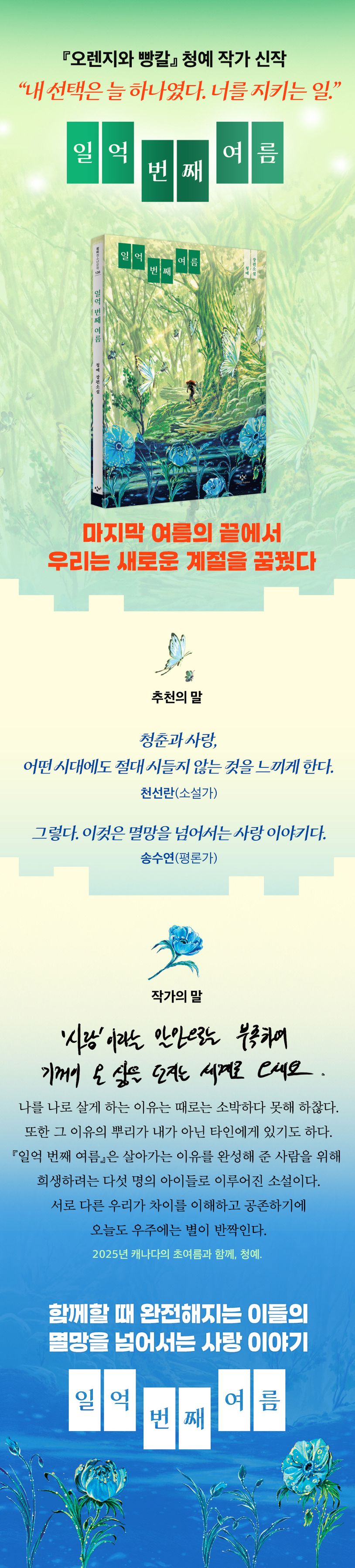 한국과학문학상, 교보문고 스토리 공모, K-스토리 공모 등 각종 공모를 휩쓸고 예스24 ‘한국문학의 미래가 될 젊은 작가’에 선정된 청예의 신작 장편소설 『일억 번째 여름』(창비청소년문학 136)이 출간되었다. 『오렌지와 빵칼』 『낭만 사랑니』 등 도발적인 시선과 독특한 문장으로 주목받은 청예는 이번 작품에서 처음으로 곡진한 사랑 이야기를 펼쳐 보인다. 무더운 여름만이 반복되는 세계에서 멸망을 막기 위해 함께하는 이들은 과연 불안과 공포를 이겨 내고 새로운 계절을 맞이할 수 있을까? 서로를 구하기 위해 기꺼이 온 삶을 내던지는 모습이 깊은 울림을 전하는 가운데, 잔혹한 운명 속에서 피어나는 애달픈 사랑이 진한 잔상을 남긴다.