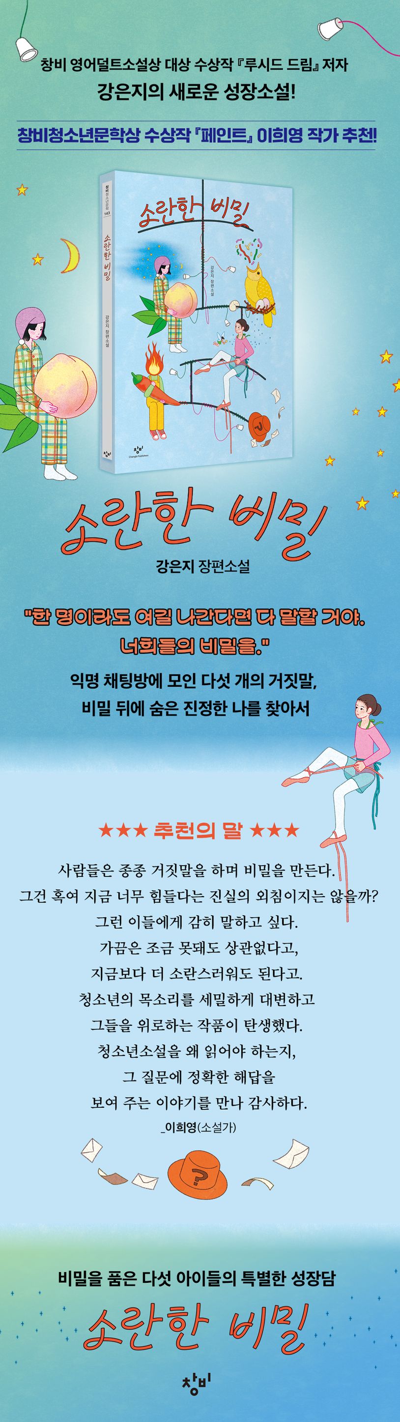 『루시드 드림』으로 제5회 창비×카카오페이지 영어덜트소설상 대상을 수상한 작가 강은지가 신작 장편소설 『소란한 비밀』(창비청소년문학 143)로 돌아왔다. 저마다의 비밀을 품은 다섯 명의 청소년이 익명 채팅방 ‘거짓말 무덤’에 모이며 펼쳐지는 미스터리 성장소설로, 서로의 정체를 찾아 가는 스릴러적인 긴장감이 읽는 재미를 더하며 비밀과 상처를 딛고 나아가는 청소년 인물들의 성장이 공감 가게 표현된 작품이다.