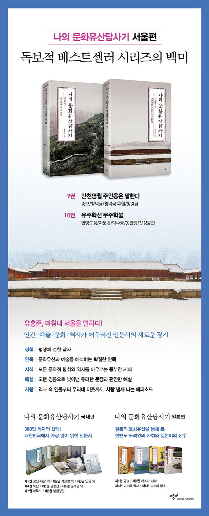 이번 《서울편》에서 저자는 문화재청장 재직 시절의 경험을 바탕으로 방대한 정보와 내밀한 사정들을 능숙하게 버무려서 문화유산을 입체적으로 볼 수 있게 도와준다. 건축물을 돌아보는 천편일률적인 기행에서 나아가 그 공간의 내력, 그곳에 머물렀던 사람들의 이야기 등 조금 더 밀도 높은 답사를 안내한다. 서울에 자부심을 지니고, 생활공간으로서 서울을 보다 깊이 이해하고 즐길 수 있도록 널리 알려졌던 지역과 배제되었던 지역을 아우르며 세계에 유례를 찾을 수 없는 수도 서울의 진면목을 알게 한다.