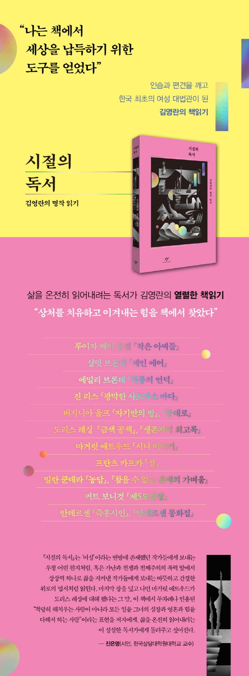 한국 최초의 여성 대법관이자 ‘소수자의 대법관’ 김영란이 자신의 삶을 구성했던 독서의 경로를 담은 책 『시절의 독서』를 펴냈다. 김영란은 1981년부터 판사로 일했고 2004년부터는 6년간 대법관으로 재직하면서 우리 사회의 정의 확립과 민주주의의 가치를 지키는 데 앞장서왔다. 그는 30년 가까이 한국사회의 최전선에서 법률가로 살아왔으면서도 평생 유일하게 계속해온 것이 책읽기뿐이라고 말할 정도로 열정적인 애독가다. 이 책에서는 특히 문학작품에 대한 그의 해박한 지식과 작가에 대한 다정한 관심, 텍스트를 사회현실과의 긴밀한 연관 속에서 바라보는 통찰력을 엿볼 수 있다. 어린 시절 탐독한 『작은 아씨들』과 브론테 자매의 소설, 일과 가정에서의 의무를 동시에 요구받았던 여성의 입장에서 읽은 도리스 레싱, 직업적 법률가라는 정체성과 경험을 통해 해석한 카프카, 6월항쟁 직후의 정치적 상황 속에서 읽은 쿤데라 등을 대상으로 작가와 문학의 관계, 문학과 현실의 관계에 대한 깊이 있는 분석과 사색을 담았다. 한편 이 책은 삶에서 부딪히는 상처를 극복하기 위해, 미로 같아 보이는 세상을 납득하기 위해 책읽기에 열렬히 빠져들었던 김영란의 내밀한 고백으로도 읽힌다. 일생 내내 자유를 꿈꾸기 힘든 시대를 살았던 그에게 문학은 다른 세상을 꿈꾸게 해주는 유일한 탈출구였다. 김영란에게 문학은 ‘거짓으로의 도피’가 아니라 ‘거짓으로부터의 도피’였으며, 그가 책으로부터 얻은 위로와 격렬한 현실 인식이 이 책을 통해 독자들에게도 전해지리라 기대한다.