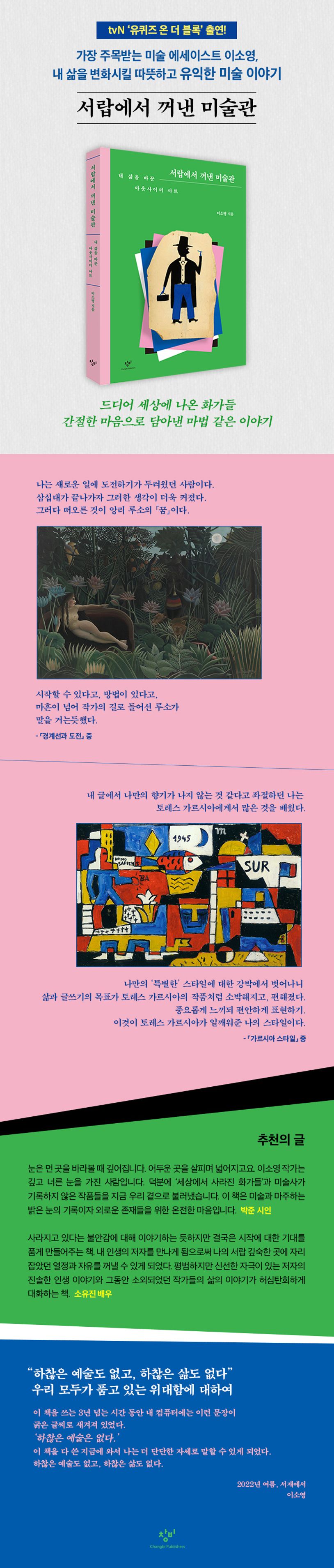 tvN ‘유퀴즈 온 더 블록’ 출연 등 다양한 방송활동으로 화제를 모은 미술 에세이스트 이소영이 이번에는 숨겨진 미술사의 비밀을 가득 안고 독자들을 찾아왔다. 『서랍에서 꺼낸 미술관』은 저자의 오랜 관심사 ‘아웃사이더 아트’를 찾아다닌 마음의 여정을 기록한 책이다. 아웃사이더 아트는 정규교육을 받지 않은 화가의 작품을 지칭하는 용어로, 이미 미술계에서는 근래에 가장 주목받는 영역에 속한다. 이소영은 백인 남성·강대국 중심의 미술사에서 사라질 수밖에 없던 화가들의 이야기를 자기의 내밀한 고백들과 함께 먼지 쌓인 서랍에서 꺼내놓는다. 이들 각각의 이야기는 그 자체로 새롭고 읽을 만한 일화로 가득 차 있을뿐더러 힘들고 지친 현대인들에게 저마다의 감동으로 다가온다. 이 책이 “밝은 눈의 기록이자 외로운 존재들을 위한 온전한 마음”(추천사, 시인 박준)인 이유도 그 때문이다.