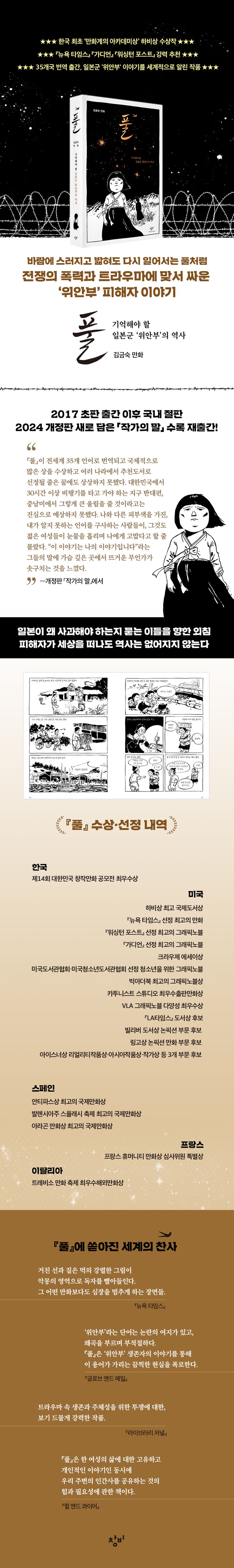 일본군 ‘위안부’ 피해자 이옥선 할머니의 생애를 그린 만화. 국제만화계에서 최고의 권위를 가진 하비상을 한국 최초로 수상하고 아이즈너상 3개 부문에 후보로 지명되는 등 국제적으로 주목받으며 ‘위안부’의 실상을 세계에 알린 작품이다. 『풀』은 ‘위안부’ 피해자를 수동적으로 그리는 기존 시각을 넘어서 삶에 대한 강한 의지를 가지고 전쟁을 반대하는 평화운동가이자 인권운동가로 살아가는 주체적이고 현재적인 존재로 그려낸다. 『뉴욕 타임스』 『가디언』 『워싱턴 포스트』 등 전 세계 유수의 매체에서 최고의 그래픽노블로 선정했고 미국 크라우제 에세이상, 빅아더북 최고의 그래픽노블상, 카투니스트 스튜디오 최우수출판만화상, 프랑스 휴머니티 만화상 심사위원 특별상, 스페인 안티파스상 최고의 국제만화 부문, 이탈리아 트레비소 만화 축제 최우수해외만화상 등을 수상했다. 본 개정판은 2017년 초판 출간 이후 절판된 작품을 다듬고 2024년에 부치는 「작가의 말」을 덧붙여 새로이 선보인다. 한국을 넘어 세계적으로 주목받는 만화가로 자리잡은 김금숙은 『풀』 외에도 한국전쟁 이산가족, 조선 최초의 여성 볼셰비키의 삶, 발달장애 청년 등 다양한 개인의 이야기를 통해 시대의 보편성과 아픔을 담담하게 담아내는 작품을 그리고 있다.