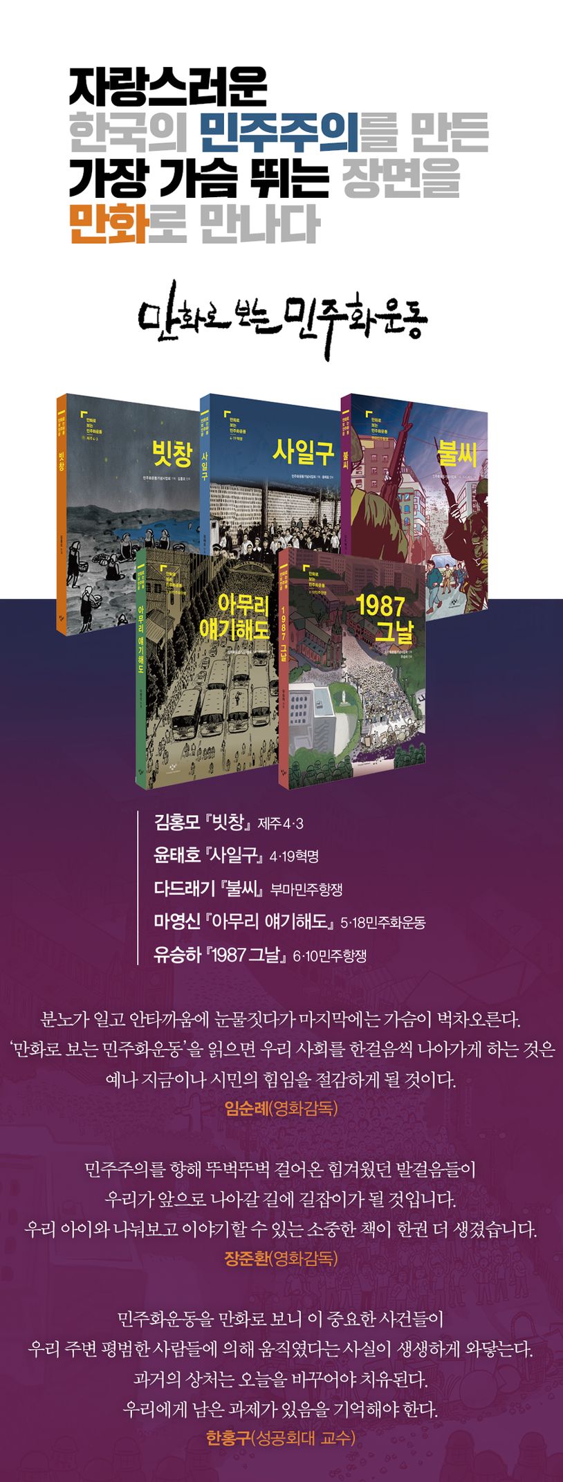‘만화로 보는 민주화운동’ 시리즈는 우리 사회가 지금의 민주주의를 이루어내기까지 거쳐온 길을 흥미롭게 조명한다. 다섯 작품 모두 의미가 깊은 사건들을 새롭게 발견하며 역사적 의미와 만화적 재미를 고루 담았다. 어제의 교훈과 내일의 희망을 이야기하는 모든 ‘민주화운동’은 성숙한 시민들과 함께 계속 기억될 것이다.