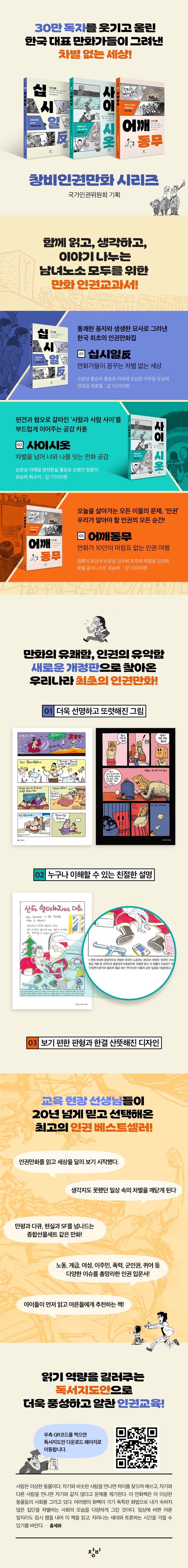 “인권만화를 읽고 세상을 달리 보기 시작했다” “생각지도 못했던 일상 속의 차별을 깨닫게 된다” “노동·여성·이주 등 다양한 이슈에 관해 읽고 토론할 수 있는 인권 입문서” “학생 때 처음 읽었고, 선생님이 된 지금도 학생들과 같이 읽는다”라며 전세대에 걸쳐 이어지는 독자들의 호평은 이 시리즈가 우리 사회의 차별을 얼마나 여실히 담아냈는지, 그리고 인권이라는 가치에 대한 관점을 어떻게 확장해주는지 보여주는 확실한 방증이다.