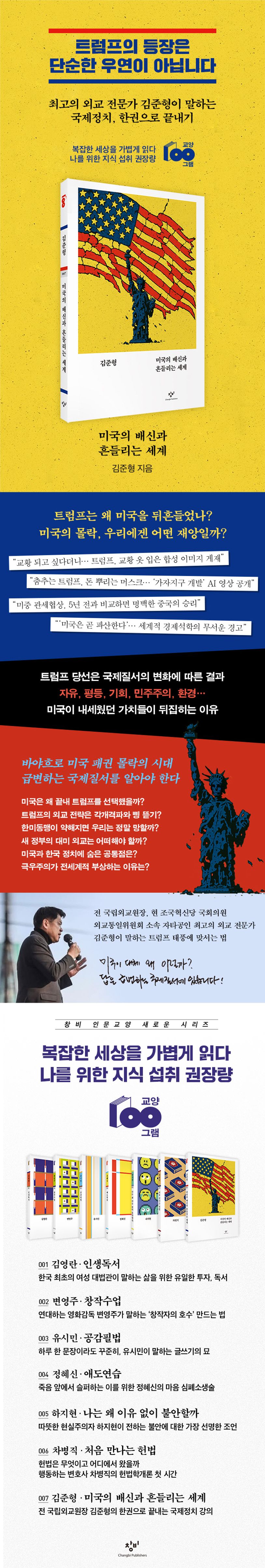 2024년 재선에 성공하며 도널드 트럼프가 다시 한번 미국 대통령 자리에 올랐다. 이후 트럼프의 입을 통해 전해지는 미국의 정책 소식들은 한국뿐 아니라 전세계 국가들에 놀라움을 넘어 충격을 주기에 충분했다. 우방국을 포함해 다른 주권 국가를 향한 각종 망언이 쏟아지는가 하면 관세를 최대 3521% 부과한다고 했다가 철회하는 등 한 국가의 대외적 행보라고 하기에 터무니없는 소식이 연일 뉴스를 장식했다. ‘도대체 미국이 왜 이럴까?’라는 질문이 자연스럽게 떠오르는 요즘, 전 국립외교원장이자 국내 최고의 외교전문가 김준형은 지금의 미국을 이해하려면 급변하는 국제정치의 흐름을 알아야 한다고 강조한다. 트럼프라는 인물의 (재)등장이 단순한 일탈이나 기현상이 아니라 현재 진행되는 글로벌 파편화의 원인이자 결과이며 동시에 동력이라는 것이다. 창비 인문교양 시리즈 ‘교양100그램’의 일곱번째 책 『미국의 배신과 흔들리는 세계』는 새롭게 재편되는 국제질서를 연속적인 하나의 흐름으로 읽어내며 이에 대응하는 미국의 전략이 어째서 파행으로 나타나는지 분석하고, 그 속에서 한국이 나아가야 할 길을 모색한다. 트럼프 현상을 넘어 국제정치를 너른 시야로 바라보고 한국의 입장에서 실질적인 대안을 고민하고자 하는 독자들에게 주요한 통찰을 안겨줄 책이다.