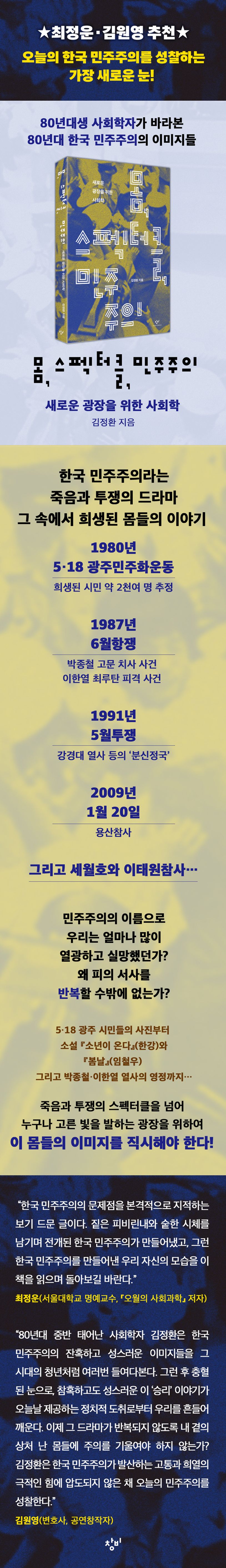 이례적으로 ‘빛의 혁명’은 희생자의 피가 아닌 모두의 즐거움으로, 영웅 일인의 목소리가 아닌 다양한 민의 목소리로 이루어졌다. 이제 민주주의는 “깨치고 나아가 끝내 이기리라”라는 노랫말로 요약되는 신성한 승리서사를 넘어서야 하지 않을까? 역사적 목표를 완수하는 플레이어로서 민주시민이 될 것이 아니라, 누군가 죽고 희생되는 드라마가 반복되지 않도록 우리 곁의 상처 나고 보이지 않는 몸들에 주의를 기울여야 하지 않을까? 활달한 정치적 상상력이 필요한 지금, 새 단계로 이행 중인 민주주의의 초입에서 반드시 읽어야 할 책이다.