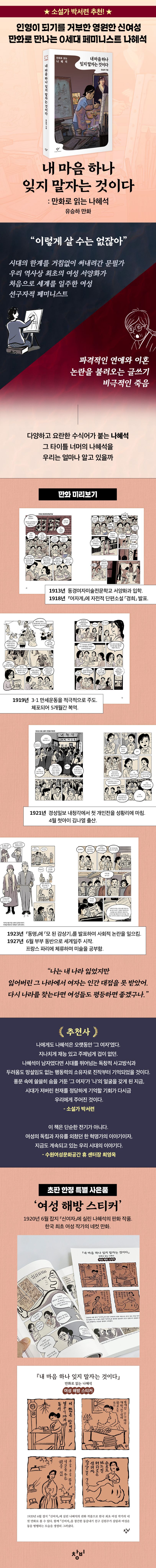 『내 마음 하나 잊지 말자는 것이다』는 몇몇 장면들로 남아 있는 나혜석의 모습에 생명을 불어넣으며 그의 삶을 생생하게 조명한다. 김원주, 최은희 등 동료 여성 지식인과의 깊은 교류, 세계일주를 하며 보고 겪은 유럽의 여성과 가족의 모습, 그의 글 「모(母) 된 감상기」만으로는 설명할 수 없는 어머니로서의 복합적인 경험 그리고 말년 수덕사에서의 삶까지. 그의 내면, 시대적 맥락, 그리고 유산을 통합적으로 서사화함으로써 나혜석은 살아 있는 인간으로 독자들 앞에 선다. 무엇보다 이 모든 것을 만화라는 형식으로 친근하게 구현해낸 이 책은 나혜석을 처음 접하는 이들에게는 더없이 친절한 안내서가 되고, 그를 잘 알고 있다고 생각했던 독자들에게는 이제껏 보지 못한 나혜석의 새로운 모습을 보여줄 것이다.