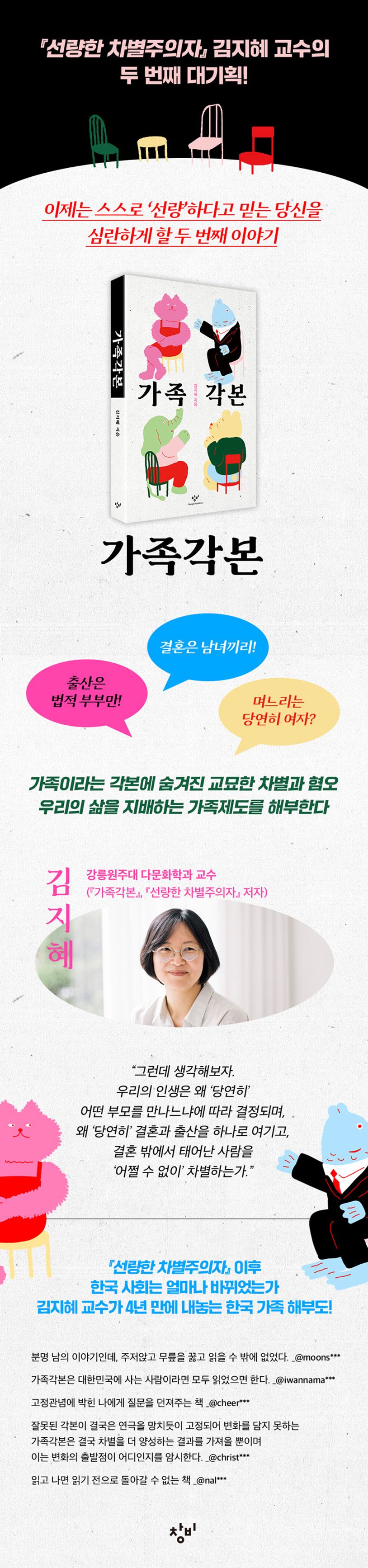 베스트셀러 『선량한 차별주의자』의 저자 김지혜 교수(강릉원주대학교 다문화학과)의 두번째 저서가 출간되었다. 전작에서 일상 속의 차별과 혐오를 날카롭게 들여다본 저자는 4년 만에 내놓는 저서 『가족각본』에서 우리가 너무나 ‘당연한’ 듯이 받아들여온 가족제도에 숨은 차별과 그에서 비롯되는 불평등을 추적한다.