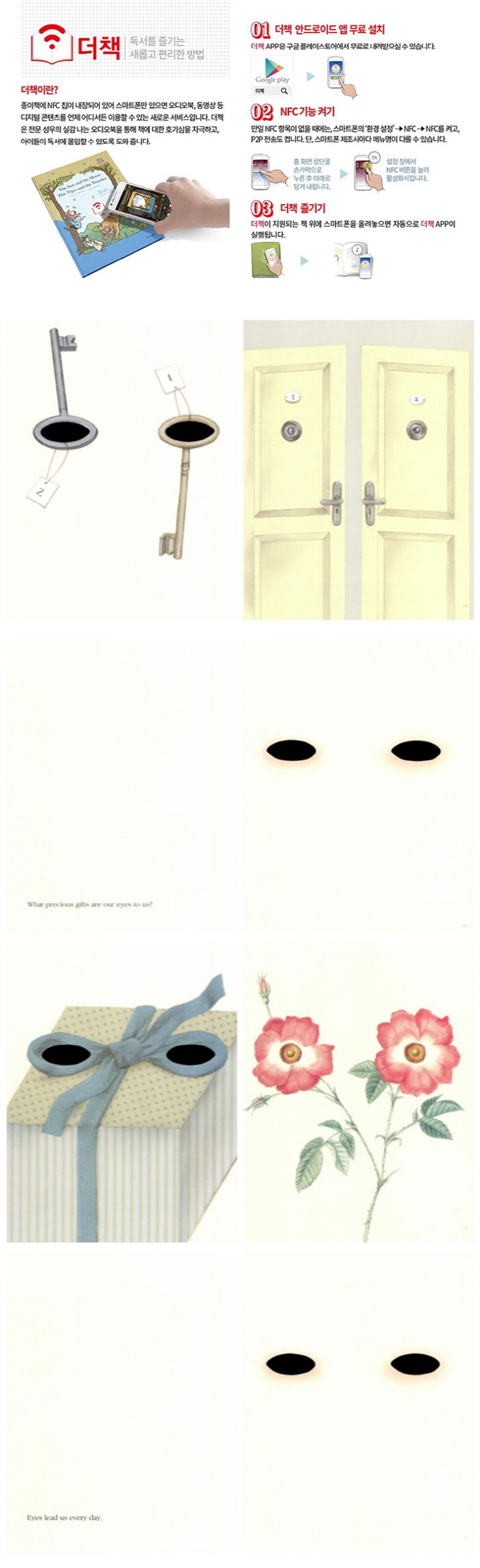 『Eyes』은 ‘눈’과 ‘볼 수 있다’는 것에 대한 작가 특유의 철학적 시선이 돋보이는 그림책입니다. 책에는 두 개의 구멍이 뚫린 장면이 반복적으로 나옵니다. 그 구멍들을 통해 보이는 그림이 마치 눈처럼 보이지만, 책장을 넘기면 전혀 다른 그림이 나타납니다. 이렇게 책의 구조를 활용한 반전은 '눈'과 '본다'는 것의 한계에 대해 생각해 보게 합니다.