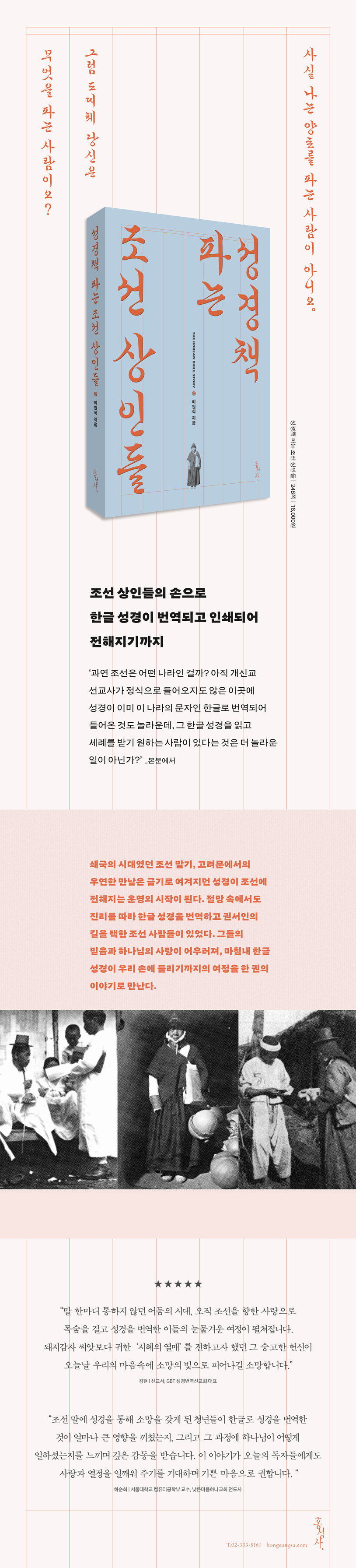 《성경책 파는 조선 상인들》(이원식 지음, 홍성사)은 한글 성경이 번역·인쇄되어 조선에 전해지기까지의 과정을 추적하며, 그 이면에 담긴 한국 근대사의 아픔과 신앙의 여정을 함께 조명한다. 저자는 하나님의 섭리 가운데 조선과 국외 여러 지역에서 이어진 만남과 사건들이 한글 성경 번역과 보급으로 완성되는 과정을 서사적으로 풀어낸다.