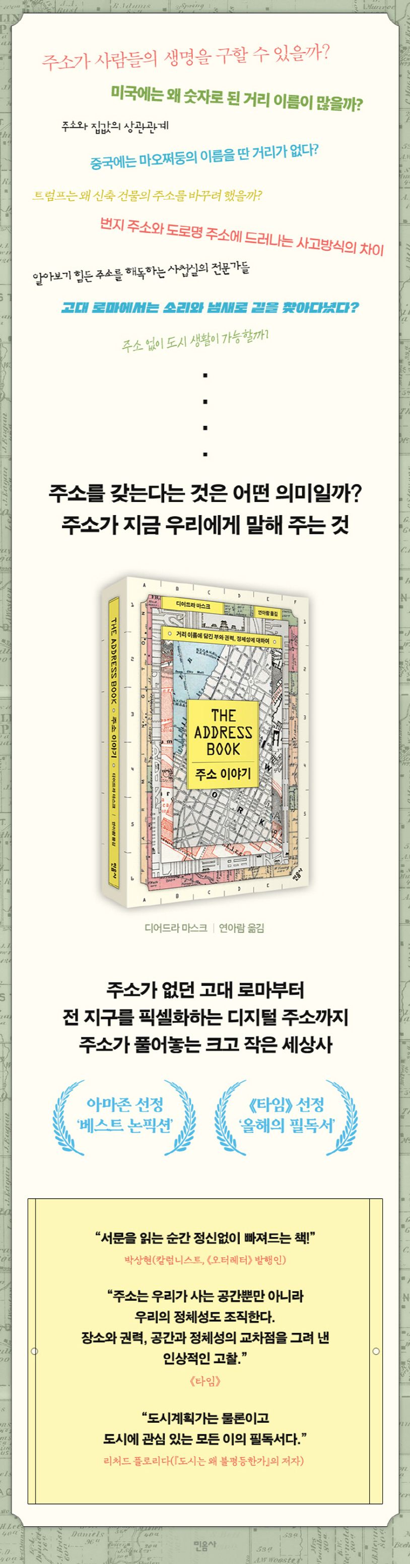 주소의 기원과 역사를 탐색하고 주소 체계와 거리 이름에 담긴 다양한 사회 정치적 이슈를 탐구하는 『주소 이야기』가 민음사에서 출간되었다. 저자인 디어드라 마스크는 미국 전역뿐 아니라 영국, 독일, 오스트리아 등 유럽 지역과 한국과 일본, 인도, 아이티, 남아프리카 공화국까지 전 세계의 사례를 취재하고 인터뷰하여 주소에 관한 다채로운 이야기를 생생하게 그려 낸다. 더불어 왓스리워즈와 구글 플러스코드 등 디지털 주소의 등장으로 변해 갈 주소의 미래를 점쳐 본다. 장소와 권력, 공간과 정체성의 교차점을 고찰하면서 일견 평범해 보이는 주소에 담긴 놀라운 역사와 의미를 풀어내는 책이다.