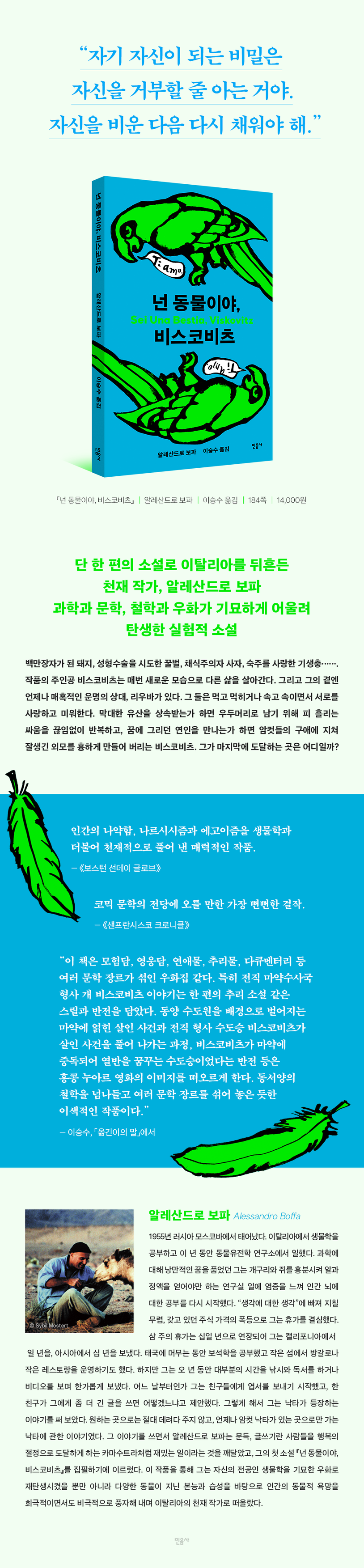단 한 편의 소설로 이탈리아를 뒤흔든 천재 작가가 있다. 모스크바에서 태어나 이탈리아에서 생물학을 공부하고, 유전학 연구소에서 일하던 알레산드로 보파는 “개구리와 쥐를 흥분시켜 알과 정액을 얻어야만 하는” 일에 염증을 느끼고 태국의 섬으로 휴가를 떠난다. 그곳에서 그는 그의 첫 번째 작품, 『넌 동물이야, 비스코비츠』를 완성한다. 백만장자가 된 돼지, 성형수술을 시도한 꿀벌, 채식주의자 사자, 숙주를 사랑한 기생충…… 작품의 주인공 비스코비츠는 매번 새로운 모습으로 새로운 삶을 살아간다. 그리고 그의 곁엔 언제나 매혹적인 운명의 상대, 리우바가 있다. 그 둘은 먹고 먹히거나 속고 속이면서 서로를 사랑하고 미워한다. 모두 스무 개의 에피소드로 이루어진 이 작품에서 주인공 비스코비츠는 서로 다른 스무 가지 생물로 등장한다. 『넌 동물이야, 비스코비츠』를 통해 알레산드로 보파는 자신의 전공인 생물학을 기묘한 우화로 재탄생시켰을 뿐만 아니라 다양한 동물이 지닌 본능과 습성을 바탕으로 인간의 동물적 욕망뿐만 아니라 악하고 약하고 모순적인 면을 다각적으로 그려냈다.
