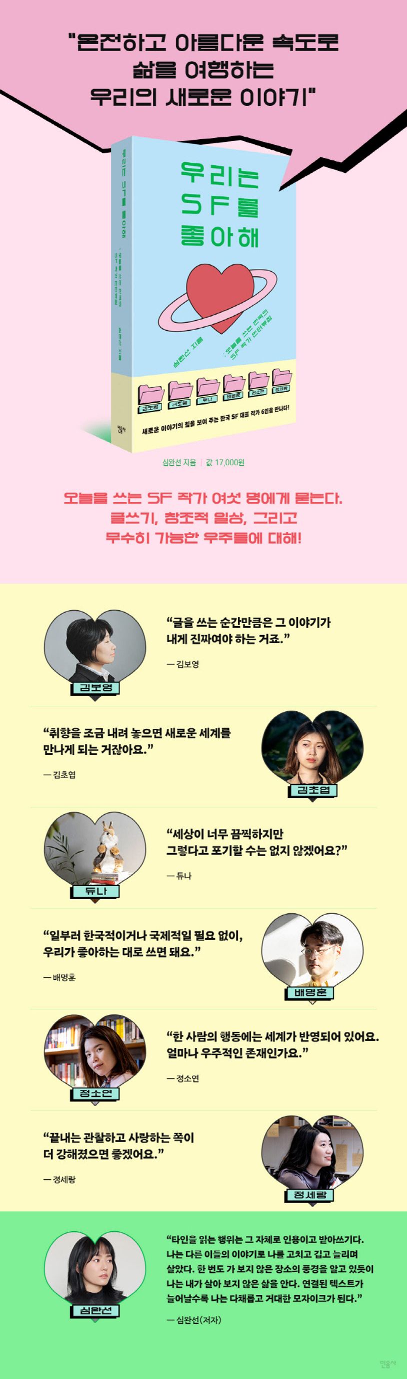 저술 활동, 비평, 해설, 강연 등 다양한 활동을 통해 SF 세계를 활발하게 이야기하는 평론가 심완선이 김보영, 김초엽, 듀나, 배명훈, 정소연, 정세랑 여섯 작가를 만났다. 새로운 세상을 이야기하는 여섯 작가의 개개인의 가치관과 사고방식, 생활을 세밀하게 담은 인터뷰집 『우리는 SF를 좋아해』는 “일어나지 않은 일, 하지만 일어날 수도 있는 일”을 다루는 SF 세계의 매력을 보여 준다.