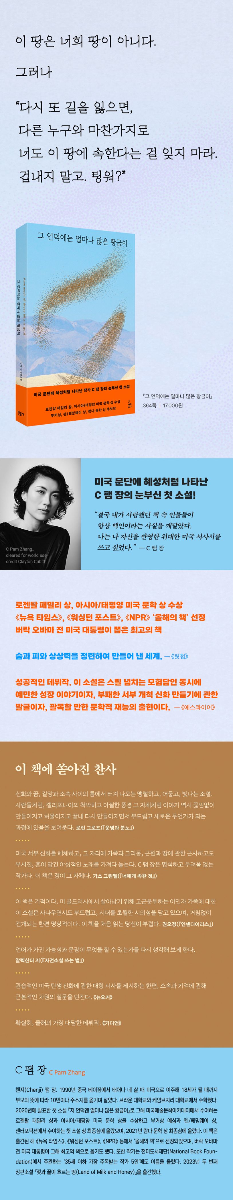 백인 남성 중심의 미국 서부 개척 신화를 중국 이민자와 여성의 시각으로 다시 써서 미국 문단과 언론에 큰 파장을 불러일으킨 『그 언덕에는 얼마나 많은 황금이』가 민음사에서 출간되었다. 중국계 미국 작가 C 팸 장의 데뷔 소설인 이 작품은 미국예술문학아카데미에서 주관하는 로젠탈 상과 아시아/태평양 문학 상을 수상하고, 부커상 예심과 펜/헤밍웨이 상, 센터포픽션에서 수여하는 첫 소설 상, 람다 문학 상 최종심에 오르며 뛰어난 문학성을 인정받았다. 또한 《뉴욕 타임스》, 《워싱턴 포스트》, 《NPR》 등의 언론에서 ‘올해의 책’으로 선정되었으며, 버락 오바마 전 대통령이 읽은 그해 최고의 책으로 꼽히기도 했다. 이 작품으로 C 팸 장은 전미도서재단에서 주관하는 ‘35세 이하 가장 주목받는 작가 5인’에 이름을 올리며 미국에서 가장 눈여겨보아야 할 젊은 작가로 급부상했다.