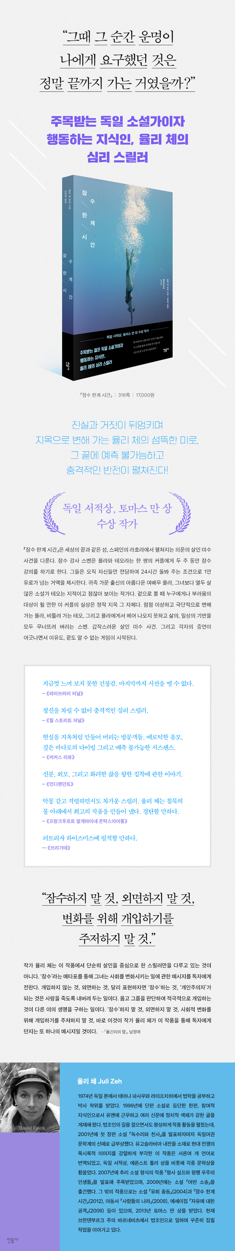 진실과거짓이뒤엉키며지옥으로변해가는율리체의섬뜩한미로,그끝에예측불가능하고충격적인반전이펼쳐진다!“그때그순간운명이나에게요구했던것은정말끝까지가는거였을까?”마치퍼트리샤하이스미스를연상케하는율리체의기묘한심리스릴러토마스만상(2013),독일서적상(2002),에른스트톨러상(2003)수상작가독일에서가장주목받는소설가이자행동하는지식인의표상독일,나아가유럽문단이사랑하는소설가,젊은나이에화려한수상경력이돋보이는율리체의『잠수한계시간』이민음사에서단행본으로출간되었다.왕성한저작활동을병행하며법학박사학위를받은율리체는작가로서의예민한감각과섬세한언어,법학도로서의전문적지식과예리한논리로무장한채문학이라는유토피아에틀어박혀있기를거부하고,현장을누비며세상을향해거침없이자신의목소리를내는작가다.『잠수한계시간』은세상의끝과같은섬,스페인의라호라에서펼쳐지는의문의살인미수사건을다룬다.스페인의어느섬에서잠수강사를하는스벤은어느날욜라와테오라는한쌍의커플에게두주동안잠수강의를하기로한다.그들은오직자신들만전담하여24시간돌봐주는조건으로1만유로가넘는거액을제시한다.귀족가문출신의아름다운여배우욜라,그녀보다열두살많은소설가테오는지적이고점잖아보이는작가다.겉으로볼때누구에게나부러움의대상이될만한이커플의실상은정작지옥그자체다.점점이상하고극단적으로변해가는욜라,비틀려가는테오,그리고욜라에게서헤어나오지못하고삶의,일상의기반을모두무너뜨려버리는스벤.갑작스러운살인미수사건.그리고각자의증언이어긋나면서이유도,끝도알수없는게임이시작된다.세상의끝과같은섬,스페인의라호라에서일어난의문의살인미수사건아름다운여배우욜라와성불능,창작불능에빠진작가테오,그리고욜라에게빠져드는잠수강사스벤의심리게임독일에서아버지가의사인유복한집안에서태어난스벤은법학을자신이다른학생들보다더뛰어남을확인받고,후에사회로진출하여더나은지위를확보하는수단으로인식했던법학도다.그런데로펌면접관이비열한질문으로자신을길들이려고하자스벤은독일(세상)의평가시스템으로부터벗어나겠다고결심한다.부모와도친지와도친구들과도인연을끊은채스벤은스페인의어느섬에정착하여잠수강사로고요히살아간다.평가를혐오하는스벤은‘개입하지않다’라는원칙을지키며살아간다.이렇게철저하게개인주의자로살아가는삶은바로‘잠수’와도맞닿는다.‘잠수한계시간.’원제인Nullzeit를직역하면‘무감압잠수한계시간’이다.스벤은잠수를배우러온욜라와테오에게‘무감압잠수한계시간’은“수면위로바로돌아가더라도건강에해를입지않으면서특정한수심에서잠수할수있는시간”이라고설명한다.즉감압등의별다른절차없이최대한잠수할수있는시간이바로‘잠수한계시간’이며작품속에서실제잠수와도피로서의‘잠수’라는이중적층위에서사용된다.그러나스벤은‘개입하지않는다’는원칙과달리점점욜라와테오에게얽혀들어간다.“전쟁은지리적현상이아니”며“발생한문제를물속에서해결하지못하면그문제는결코해결될수없”기때문에스벤이주장하는전쟁을해결하고싶다면,그전쟁이벌어지는곳에서그전쟁과맞서야한다.그렇지않으면그전쟁은결코해결될수없다.“잠수하지말것,외면하지말것,변화를위해개입하기를주저하지말것.”평가와비판과증오로전쟁중인세상으로부터의도피율리체는스벤의도피와잠수,그리고마지막변화에이르기까지,단순한살인사건이나스릴러적재미에서한발더나아가,독자로하여금스스로를되돌아보게한다.우리는현실로부터도피하려고하고있지는않은가?개인주의라는틀에갇혀,나혼자만괜찮으면된다는의식아래주변일에눈을감고귀를닫고아무런행동도하지않은채살아가고있는것은아닌가?물바깥,현실삶을외면하고물아래,주변사람도없고분쟁도없는,귀찮을일도화날일도슬플일도없는물아래에서잠수하고만있는것은아닌가?그리고이러한목소리를던지는것이야말로작가율리체의진면목이라고할수있다.