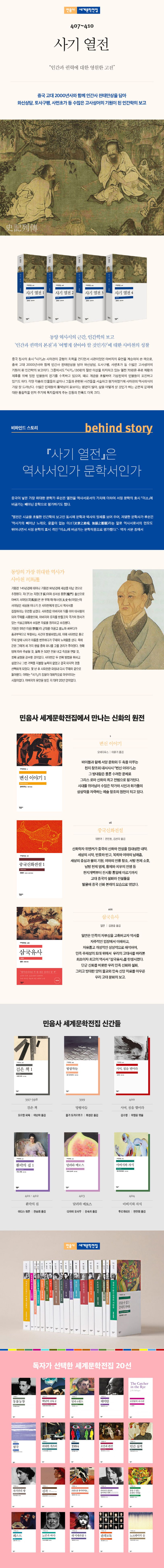 대표적 인문학 스테디셀러로서 판과 쇄를 거듭하며 많은 독자들의 사랑을 받아 온 김원중 교수의 『사기 열전』이 민음사 세계문학전집에 편제되었다. 중국 정사의 효시 『사기』는 사마천이 궁형의 치욕을 견디면서 사관이었던 아버지의 유언을 계승하여 쓴 책으로, 중국 고대 2000년사와 함께 인간사 천태만상을 담아 와신상담, 토사구팽, 사면초가 등 수많은 고사성어의 기원이 된 인간학의 보고이다. 그중에서도 『사기』 130편의 절반 이상을 차지하고 있는 열전 70편은 주로 제왕과 제후를 위해 일한 인물들의 전기를 수록하고 있으며, 때로 계급을 초월하여 기상천외의 인물들이 포진하고 있기도 하다. 각양 각층의 인물들의 삶이나 그들과 관련된 사건들을 서술하고 평가하였기에 사마천의 역사의식이 가장 잘 드러난다. 수많은 인재들의 활약상이 돋보이는 명편이 많아, 삶을 어떻게 살 것인가 하는 근본적 문제에 대한 통찰력을 던져 주기에 독자들에게 주는 감동의 진폭도 더욱 크다. 중국이 낳은 가장 위대한 문학가 루쉰은 열전을 역사서로서의 가치에 더하여 서정 문학의 효시 「이소」에 버금가는 뻬아닌 문학으로 평가하기도 했다.