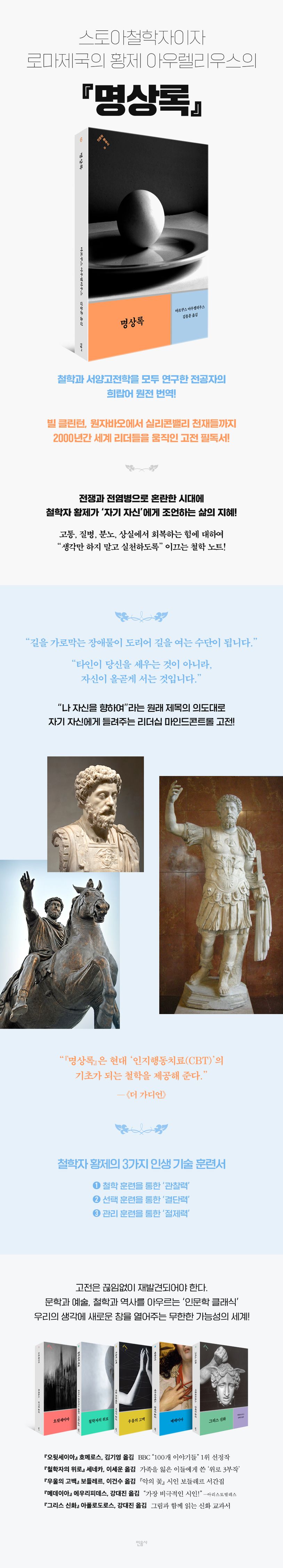 아우렐리우스는 후기 스토아학파 철학자로서 5현제(賢帝) 가운데 마지막 황제다. 그래서 이번 『명상록』은 고대철학을 연구한 철학자이자 대학에서 희랍어를 가르친 서양고전학자에 의해 새롭게 완역되었다. 아우렐리우스의 철학뿐 아니라 당시 잠언록이라는 장르의 글쓰기 방식을 이해하는 데 모범적인 길잡이가 될 것이다. 『명상록』은 “삶의 개선을 위해 자기를 변화시키려는 사람에게 좋은 안내서가 될” 것이다.