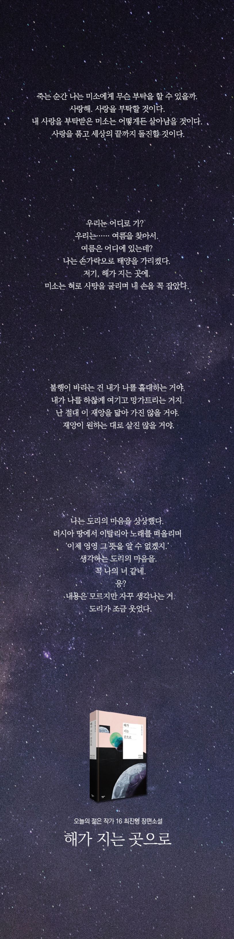 문학성과 다양성, 참신성을 기치로 한국문학의 미래를 이끌어 갈 신예들의 작품을 엄선한 「오늘의 젊은 작가」의 열여섯 번째 작품 『해가 지는 곳으로』. 데뷔 이래 특유의 박력 있는 서사와 긴 여운을 남기는 서정으로 사랑하는 존재로서의 인간을 꾸준히 그려내며 한겨레문학상, 신동엽문학상을 수상한 작가 최진영의 다섯 번째 장편소설이다. 이번 작품은 저자가 처음으로 선보이는 아포칼립스 소설로, 재앙의 한복판에서도 꺼지지 않는 두 여자의 로맨스를 그리고 있다.