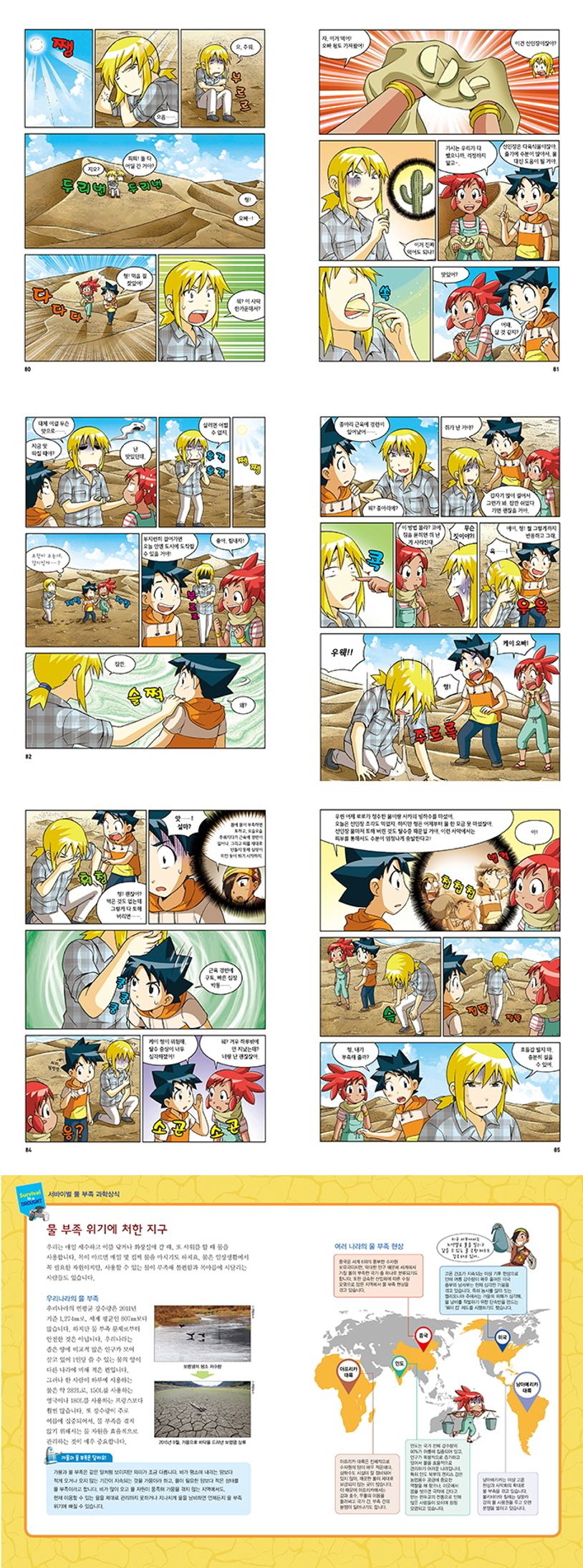 아슬아슬한 모험을 통해 과학상식을 배우는 「서바이벌 만화 과학상식 시리즈」시리즈『물 부족에서 살아남기』. 재미있는 만화를 통해 과학상식을 효과적으로 전달한다는 평가를 받으며 아이들의 사랑을 받아온 시리즈로, 이번에는 일 년째 비가 내리지 않아 심각한 가뭄이 찾아온 상황에서 낯선 사막에 떨어진 지오와 피피, 케이가 깨끗한 물을 찾기 위해 고군분투하는 이야기가 펼쳐집니다. 지구의 물 부족 상황, 물이 없으면 생기는 일들, 수질 오염의 원인과 물 부족 문제의 해결 방법 등 물 부족과 관련된 정보를 폭넓고 다양하게 배울 수 있습니다. 한층 업그레이드된 재미와 정보, 생생한 이야기를 친근하고 역동적인 그림을 통해 만나 보세요!