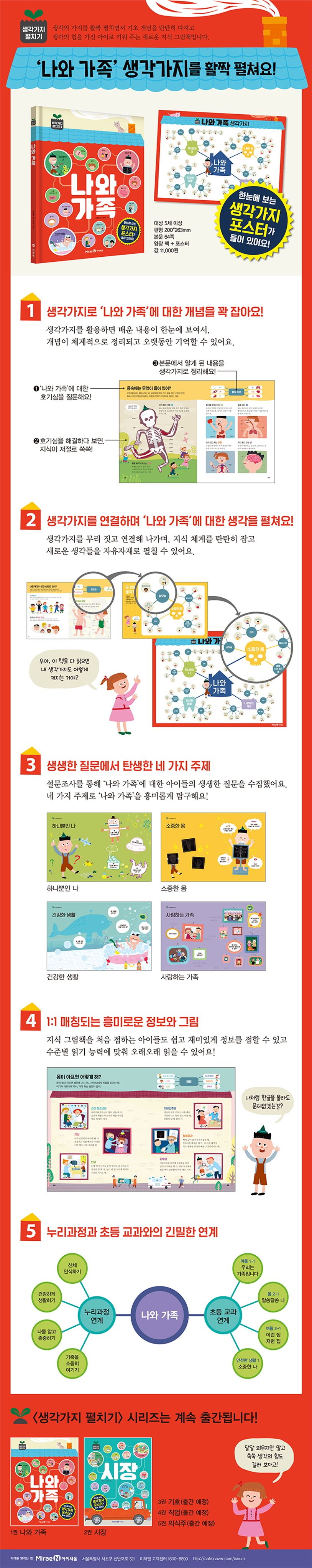 〈생각가지 펼치기〉 시리즈 『나와 가족』은 생각의 가지를 활짝 펼치면서 기초 개념을 탄탄히 다지고, 생각의 힘을 가진 아이로 키워 주는 새로운 지식 그림책입니다. 이 책은 초등 입학 전에 꼭 알아야 할 ‘나와 가족’에 대한 호기심을 탐구하며, 알게 된 지식을 생각가지로 펼쳐 보는 그림책이에요. 생각가지를 활용하면 한눈에 지식이 보여서 기억이 쏙쏙, ‘나와 가족’에 대한 생각도 가지가 뻗듯이 자라나요. 한눈에 보는 생각가지 포스터도 들어 있어요.