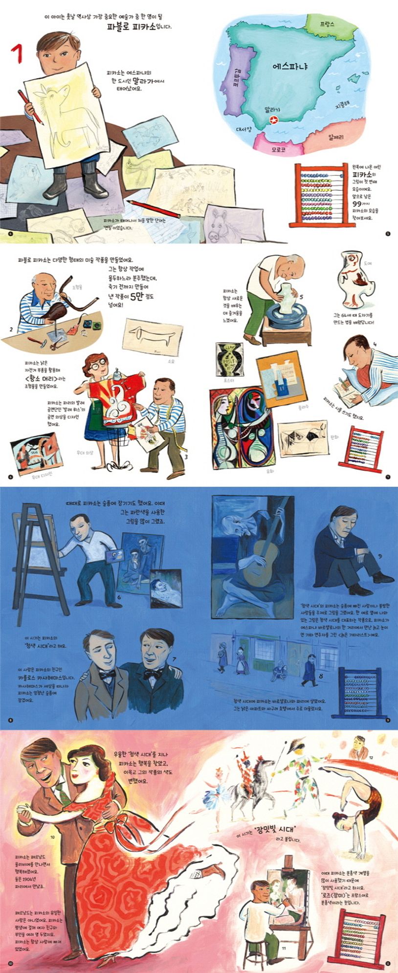 책에 나오는 피카소는 잔뜩 어질러진 작업실에서 그림을 그리고 스트레칭을 하는가 하면, 길쭉한 아프리카 가면과 똑 닮은 자화상에 쏙 들어가 있기도 하고, 다리가 짧은 개인 닥스훈트와 즐거운 시간을 보내기도 합니다. 피카소는 평생 그림만 그린 것이 아닙니다. 도예, 조형물, 포스터, 의상과 무대 디자인 등 다양한 작업을 했지요. 화가로만 알고 있는 피카소의 새로운 모습도 발견해보세요!