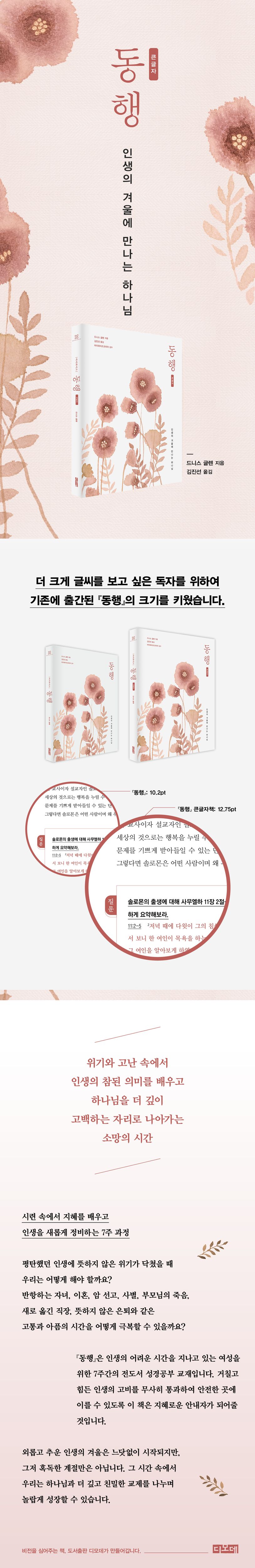 『동행』은 인생의 어려운 시간을 지나고 있는 여성을 위한 7주간의 전도서 공부 교재다. 인생의 겨울이라는 거칠고 힘든 길을 무사히 통과하여 안전한 곳에 이를 수 있도록 이 책은 지혜로운 안내자가 되어줄 것이다. 느닷없이 시작된 인생의 겨울은 그저 혹독한 계절만은 아니다. 그 시간 속에서 우리는 하나님과 더 깊고 친밀한 교제를 나누며 놀랍게 성장할 수 있다.