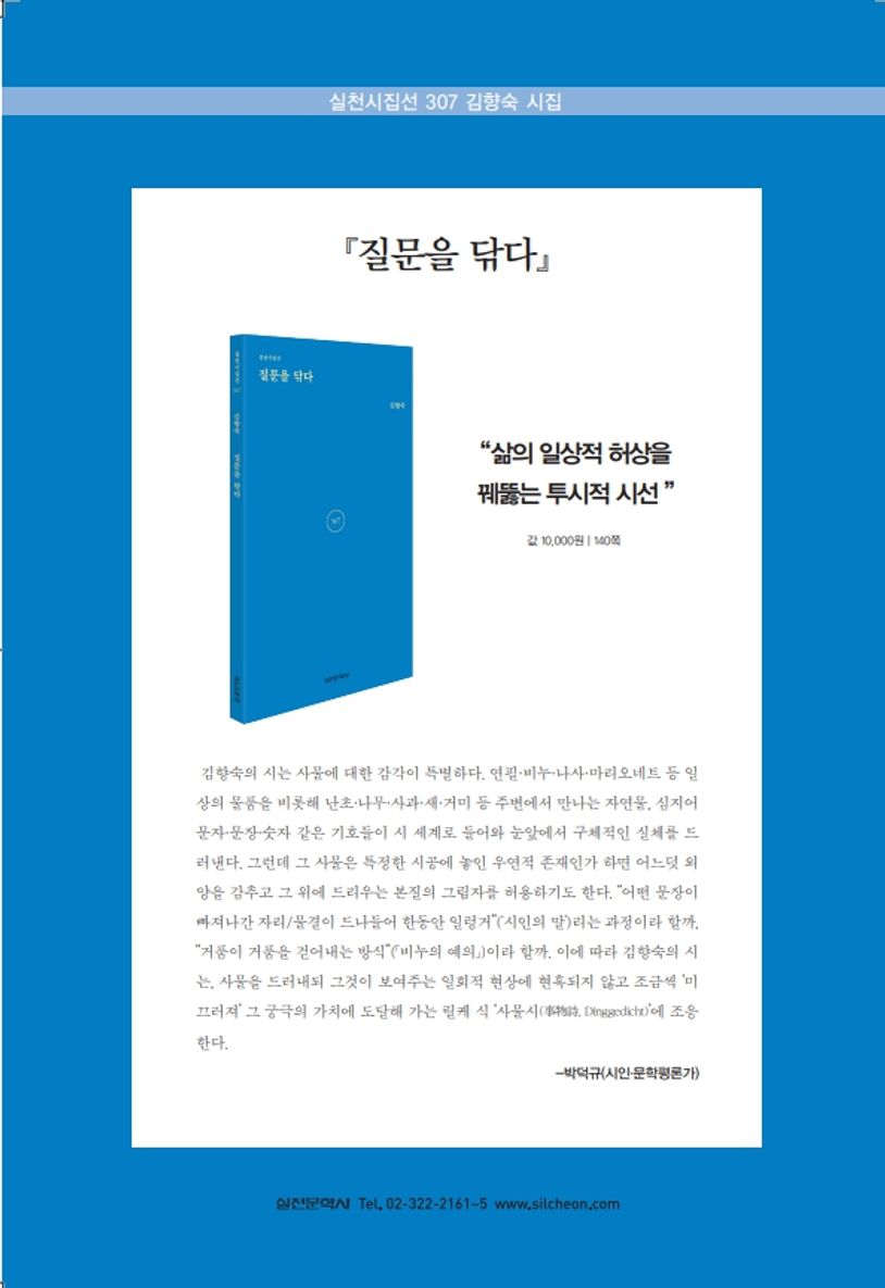 2019년 경남신문 신춘문예 시 「명왕성 유일 전파사」가 당선되어 작품 활동을 시작했고, 토지문학제 평사리문학상 시 부문 대상, 황순원 디카 시 대상, 이병주 탄생 100주년 팬픽에서 금상, 호미문학상, 최충문학상 대상 등을 수상한 김향숙 시인이 첫 시집 『질문을 닦다』를 《실천문학사》에서 출간했다. 이 시집에는 시집의 제목 『질문을 닦다』처럼 사물과 인생의 본질에 대한 근원적인 질문을 던지고 사유하는 관찰자의 시선으로 형상화한 4부 49편의 미려하면서도 진지한 시어로 가득한 시들이 실려 있다. 이 시집의 해설자가 ‘최근 필자가 본 시들 가운데 이 시인의 시들처럼 관찰다운 관찰을 보여준 사례를 본 적이 없었다.’는 상찬의 글과 김향숙의 시는 ‘삶의 본질을 관(觀)하면서 통(通)하고 뭉개면서 일으켜 세운다.’거나 ‘사물을 드러내되 그것이 보여주는 일회적 현상에 현혹되지 않고 조금씩 미끄러져 그 궁극의 가치에 도달해 가는 릴케 식 사물시(事物詩, Dinggedicht)에 조응한다’는 두 추천사의 글을 통해서도 시인이 얼마나 놀랍고 특출한 질문자이자 관찰자로서의 눈을 소유하고 있는지 알 수 있다. 물론 시인의 특출한 질문에 대한 정답은 정해진 뻔한 답이 아니라 받아들이고 해석하는 독자들의 제각각의 몫이리라.