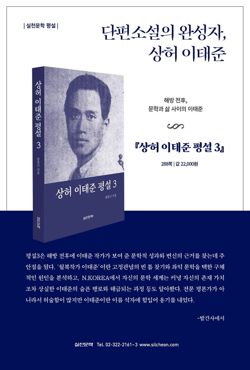 〈대한민국 단편소설의 완성자〉로 평가받는 상허 이태준 선생이 월북작가라는 이유로 고향인 철원에서조차 홀대받으며 문학관 하나 없는 현실을 타개하고 상허 이태준을 부활시키기 위해, 철원 출신 정춘근 시인이 지역 신문에 460회가 넘게 ‘상허 이태준의 삶과 문학’을 연재해 마침내 완결편인 『상허 이태준 평설 3』을 《실천문학》에서 출간했다. 이 책은 작가 이태준의 일대기와 함께 소설, 수필, 동화 등 그의 저술에 대하여 총체적이면서도 자세하게 평설하고 있다. 저자는 발간사에서 ‘전문 평론가가 아닌 사람이 쓴 글이라서 허술함이 많’다고 겸양해 하지만, 일찍이 이 책만큼 상허 이태준에 대하여 방대란 자료 인용과 함께 자세하고 구체적으로 기술한 도서는 없다고 자부한다.