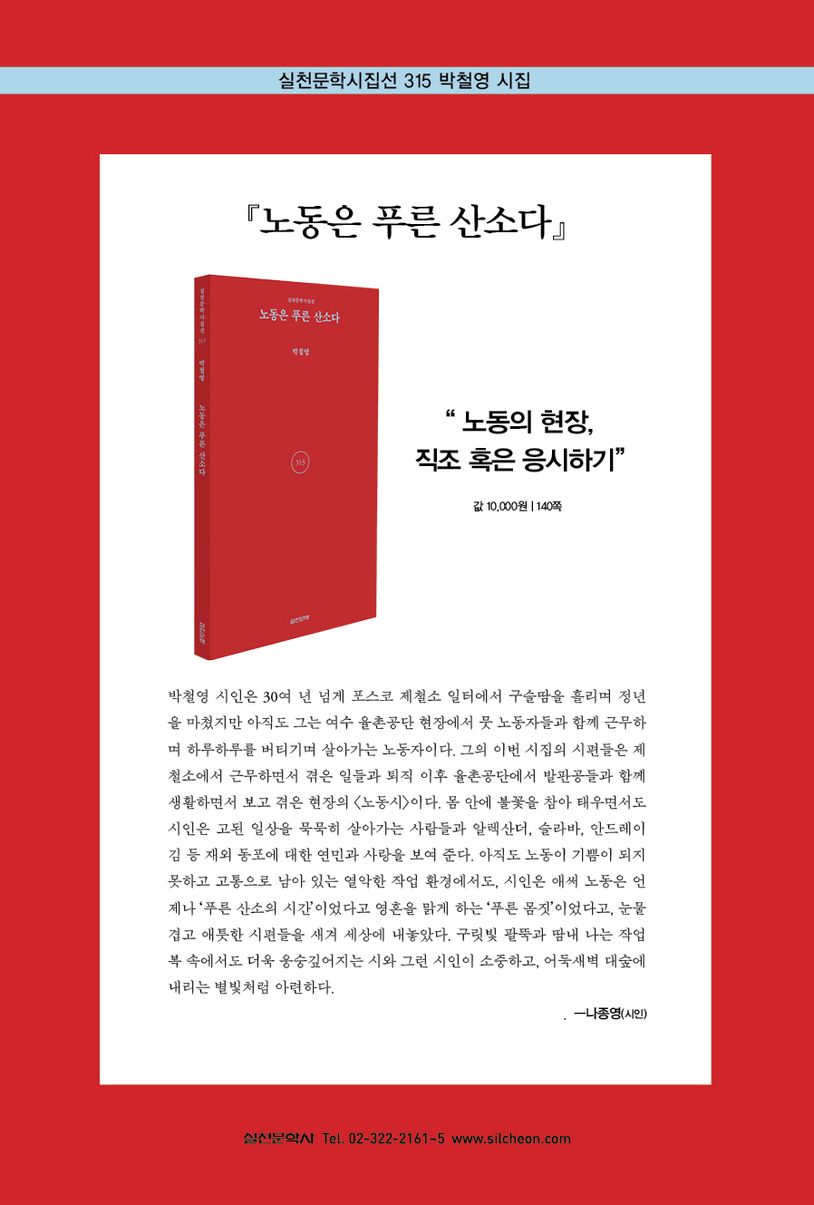 노동현장의불평등차별등을詩로직조하고노동의긍정성을노래하다근래들어노동현장의목소리를세세하게담아낸시집이드문데,이시집『노동은푸른산소다』에실린시편들을통해2025년의노동문학현장과현주소를가늠해볼수있다.여기실린시들은곳곳이노동현장으로점철돼있어마치현실판『노동의새벽(박노해시집)』을읽는듯한착각을불러온다.더욱이시적기교나장치들이과도했더라면노동현장에대한전경이많이망가졌을텐데시인은최대한현장감을살리는데주력한다.발판공,비계공,용접공들의땀과고난한삶의현장이영상을보듯선명하게그려져있다.일상이그만큼진솔하게시인이노동현장에서만난기억들을문학적으로기교없이형상화하고있는것이다.아래의시「발판공입문」,「청년비계공」,「용접공의노래」을읽어보면잘드러나있다.가장먼저해결해야할목표는손짓으로만소통하는수화를익히는일(중략)발판이허공을향해끝없이올라가는동안간간이육두문자가쏟아지기도하고심할때는표정까지일그러지곤하여서쉬는틈에도발판의종류와길이를끊임없이머릿속에입력하는것사람과사람사이를알아가는일처럼발판의모양과무게도그속이다양하였다옷으로가려진몸뚱어리곳곳의푸른멍과옹이가진손과발목을훈장처럼꺼내보이는비계공들은그들의생채기가자신의자존심이었다하루종일허공에혼잣말을주절거리다작업대를내려오는저녁이면바닥에뒹구는말들이홍수를이루고있었는데그렇게해도한번자리에서밀리면항상밑장깔이신세에서벗어날수없었다-「발판공입문」부분막장을기는현장엔막장이없다생을일으키고바로세우려는투혼의밑장을괴는터전만이존재한다4·5파이6미터파이프로바닥에베이스를박아세우면넘어져선안된다는약속이시작되었다(중략)자칫무릎이상하는일도다반사그렇게깨지고터지다보면스스로곧추서는법을알게되었다스물아홉A씨는파이프세울때맨밑바닥의보조공이다비계군단의위계는군대보다엄격해서위로누르는만큼가해진중력을아래에서버텨내야한다자칫하다간가지에달린사과가곤두박질치듯내리꽂히기도하는게이곳이다지켜보는것만으로도아슬한생의전선이다중요한것은서로에게잘엮여져야한다는것으로밑바닥부터꼿꼿하게바로서야한다는것이다.-「청년비계공」부분바람에데어도화상이지쇳물을뽑아내는거대한설비장치도하찮은바람에부딪혀화상을입는다바람이가슴으로스며들때마다데인상처의틈새는더커지고그바람구멍을메우는것이용접공의일이다익숙한철야는천팔백도고열과밤을꼬박새울수있는올빼미의눈을가져야한다날카로운발톱으로바람을누르고너덜너덜해진바람집속으로빨갛게타들어간자신의살덩이를밀어넣어야한다부서져주저앉아버린거대한설비덩어리서서히맞물려돌아가는것을본뒤에야충혈된별자리를매듭처럼풀어내는김반장부서진기계는고쳐놓았지만밤사이몸에서빠져나간살틈으로비집고들어온뼈마디를스치는바람결이관절들의마디에서쇳소리를지르게한다용접공은제몸에난바람구멍조차스스로메울수없어일생바람의노래를유행가마냥듣고살아야한다-「용접공의노래」부분시인은위시들을투박하지만노동현장의풍경을진솔하게시라고하는그릇에차곡차곡담아내고있다.노동현장이나노동현장의문화,노동현장사람들을결코미화하거나포장하지않는다.정제된감정과가식없는시어들,시적장치를뺀담담함등이오히려시적상상력을독려한다.더욱이시적기교나장치들이과도했더라면노동현장에대한전경이많이망가졌을텐데시인은최대한현장감을살리는데주력해노동현장의척박한환경을그만큼진솔하게보여주고있다.비계공이야말로죽기살기로떠받치는노동현장의비계를책임지는사람들이다.삶이각박할뿐아니라사회구성원중약자적위치에서살아가는사람들의현실을은연중노출한다.그들은그들삶에들어와있는노동의무게를감당하며묵묵히살아내고있다.세월이흘러도변하지않는것은있다개똥이말똥이만복이가이바노프성을달고비탈리가되든알렉산더가되든촉촉이젖은눈을보면알아챌수있다가끔시베리아곰을닮은것처럼왕방울눈이사나워보여도가슴깊이숨겨진사연이란것이슬픈족속들의모습이어서살기위해조선땅을떠났거나연해주에서중앙아시아로강제이주된한민족의아들이다시아들을낳아대를이어온소련에서러시아로바뀌는혹독한세월을견디다가그래도이곳을또다른조국이라며찾아온동포3세F4비자로근근이일자리찾아헤매다눈칫밥으로때우고배워가는발판비계공으로자리잡은안드레이김(후략)-「안드레이김」부분이시「안드레이김」은동포3세출신이주노동자에관한시다.노동현장에한국인만있던시대는끝났다.이주노동자들과공존해야하는시대를맞은것이다.산업현장을보면어느덧이주노동자들이셀수없을만큼많이분포해있다.그만큼이주노동자는우리안의이주민이아니라우리와함께살아가야하는동반자가되었다.이들과함께일을하고점심을같이먹으러가며,같이어울려놀러가기도해야하는세상을맞은것이다.이시는두가지민족의아픔을노출한다.약소국식민지국가민족으로서조국을떠나연해주와중앙아시아를떠돌아야했던재소(러시아우즈베케스탄등)동포에