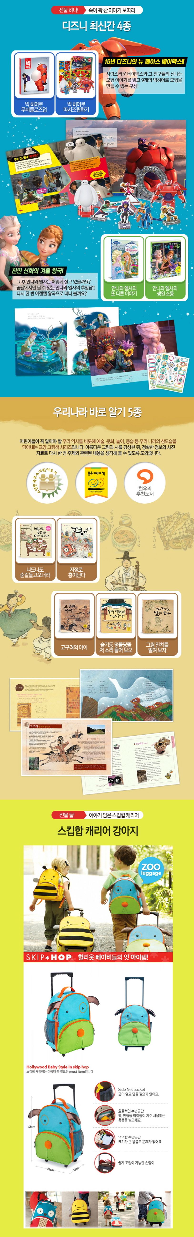 헐리웃 베이비들의 잇 아이템인 귀여운 강아지 모양의 스킵합 캐리어 속에 디즈니 만화영화 그림책을 포함한 총 9종의 도서를 담은 어린이날 선물 세트입니다. 사랑스러운 베이맥스와 그 친구들의 신나는 모험 이야기를 읽고 9개의 빅히어로 모형을 만들 수 있는 《빅 히어로 무비클로즈업》, 《빅 히어로 따서조립하기》를 비롯해, 전세계 어린이들의 많은 사랑을 받고 있는 겨울왕국 그 후의 이야기를 담은 《안나와 엘사의 또 다른 이야기》, 《안나와 엘사의 생일 소동》을 만나볼 수 있습니다. 더불어 어린이들이 꼭 알아야 할 우리 역사를 비롯해 예술, 만화, 문화, 놀이, 풍습 등 우리나라 참모습을 담아내는 교양 그림책 시리즈 5종도 함께 만나볼 수 있습니다.