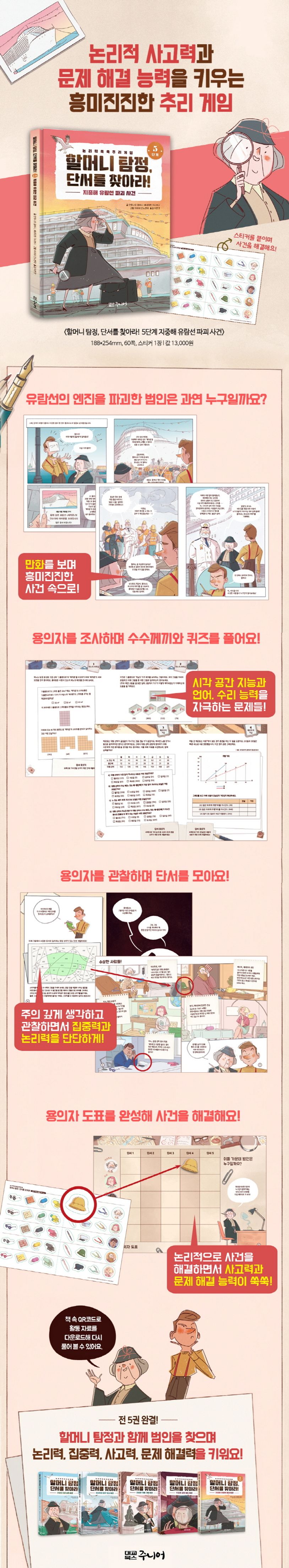 각 단계에서는 할머니 탐정과 함께 강아지 납치 사건, 옷감 도난 사건, 미술관 그림 도난 사건, 보석 절도 사건, 유람선 엔진 파괴 사건 등 흥미로운 사건을 해결하게 됩니다. 어린이 독자들은 하나씩 단서를 찾고 범인을 밝히는 활동을 하며 자연스럽게 다양한 인지 능력을 키우고 논리력을 강화하게 될 것입니다