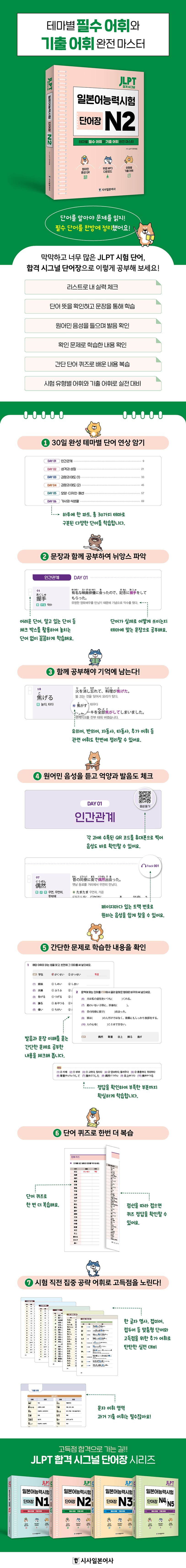 일본어능력시험 N2에 꼭 필요한 필수 단어를 테마별로 구분하여 문장과 함께 알기 쉽게 수록하고 있습니다. 본문의 모든 단어는 원어민 음성을 들으며 학습 가능하도록 QR코드 스캔 및 무료 다운로드로 음성을 제공합니다.