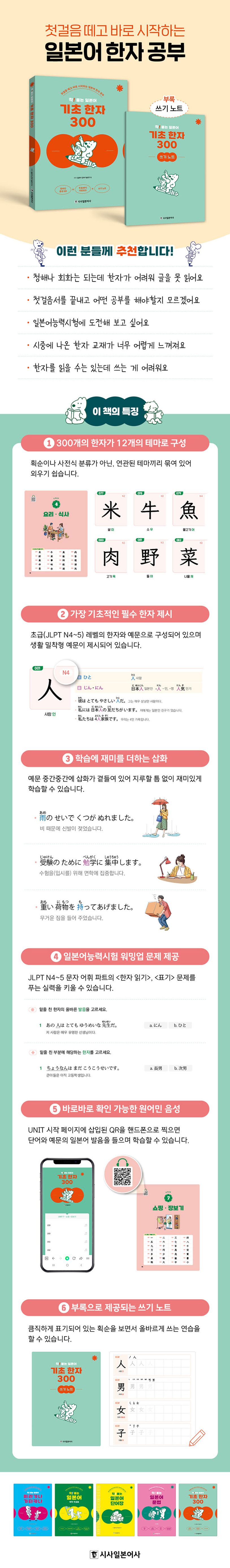일본어 초급 학습자가 가장 먼저 익혀 두어야 할 기초 한자 300개를 수록한 교재입니다. 총 12개의 테마로 구성되어 있어 관련 어휘를 쉽게 익힐 수 있으며, 부록으로 제공되는 쓰기 노트에 직접 한자를 따라 쓰며 외울 수 있습니다. 예문은 주로 초급 레벨(N4~5)의 내용으로 구성되어 있으며, 일상생활에서 많이 쓰는 표현을 다루고 있습니다.