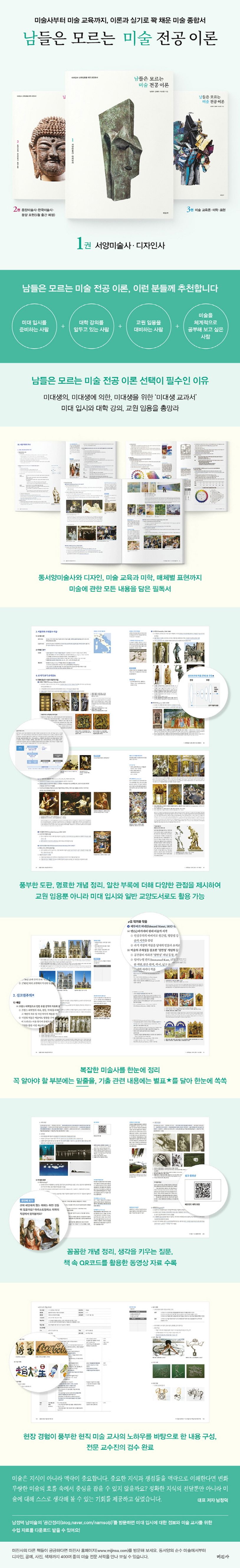 미대 입시와 교원 임용을 위한 교양 도서로, 동서양 미술사와 미학사, 미술 교육론, 매체별 표현의 종류와 특징을 알차게 수록했다. 제1권 서양미술사?디자인사에서는 고대부터 동시대에 이르기까지 서양미술사의 얼개를 풍부한 컬러 도판과 함께 시대별로 정리한다. 또 디자인사와 표현을 별도의 장으로 구성하여, 매체의 특성을 명확히 파악하고 서양미술사의 흐름과 연계하여 이해하도록 안내한다. 꼼꼼한 개념 정리, 꼭 필요한 보충 설명, 질문을 통해 사고를 키우는 “생각해 보기”란에 더해 QR코드를 활용한 동영상 자료를 수록했으며, 현직 미술 교사와 대학 교수의 검수를 통해 신뢰도를 높였다. 특히 중요한 부분에는 밑줄을 긋고, 기출 관련 내용에는 별표를 달아 한눈에 쏙쏙 들어오게 구성했다. 미술에 관해 거의 모든 내용을 담은 미대생의 필독서이다.