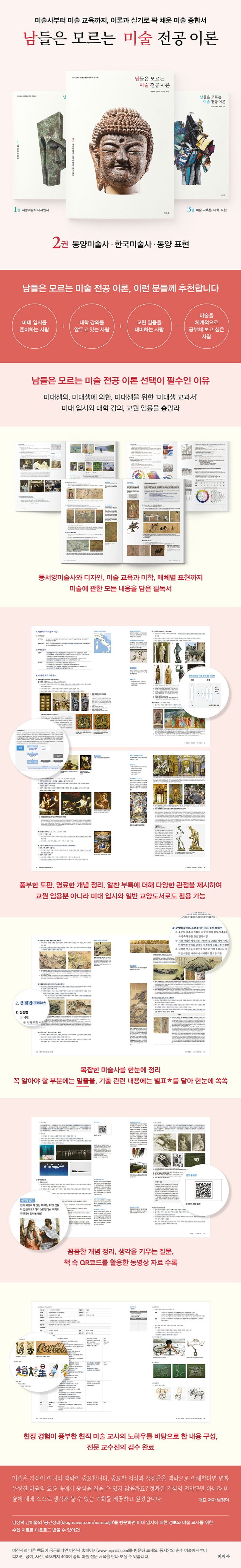 미대 입시와 교원 임용을 위한 교양 도서로, 동서양 미술사와 미학사, 미술 교육론, 매체별 표현의 종류와 특징을 알차게 수록했다. 제2권 동양미술사?한국미술사?동양 표현에서는 인도, 중국, 일본을 중심으로 한 동양미술사와 고대부터 동시대에 이르는 한국미술사의 얼개를 풍부한 컬러 도판과 함께 시대별로 정리했다. 또 회화, 서예, 조각, 공예 등의 동양 표현 파트까지 수록해 동양 미술을 더욱 폭넓고 깊이 있게 이해하도록 했다. 꼼꼼한 개념 정리, 꼭 필요한 보충 설명, 질문을 통해 사고를 키우는 “생각해 보기”란에 더해 QR코드를 활용한 동영상 자료를 수록했으며, 현직 미술 교사와 대학 교수의 검수를 통해 신뢰도를 높였다. 특히 중요한 부분에는 밑줄을 긋고, 기출 관련 내용에는 별표를 달아 한눈에 쏙쏙 들어오게 구성했다. 미술에 관해 거의 모든 내용을 담은 미대생의 필독서이다.